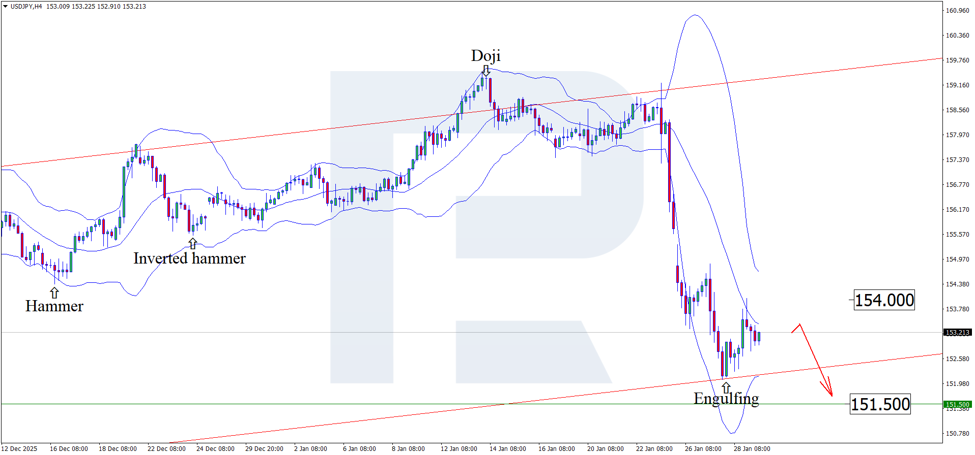 29 қаңтар 2026 жылға арналған болжам JPY үшін оң болып көрінеді. Күрт төмендеуден кейін USDJPY жұбы түзету толқынын аяқтап, төмендеуді жалғастыруы мүмкін. Қазіргі уақытта котировкалар 152.90 деңгейі маңында саудалануда.
