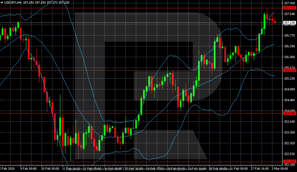 H4 графигінде USDJPY жұбы ақпан айының басындағы күрт төмендеуден кейін 152.25–152.30 аймағында минимум қалыптастырды. Осы аймақтан тұрақты жоғары кері бұрылу басталды. Өсім Bollinger Bands кеңеюімен қатар жүрді, бұл импульстың күшеюін және құбылмалылықтың артуын көрсетті.