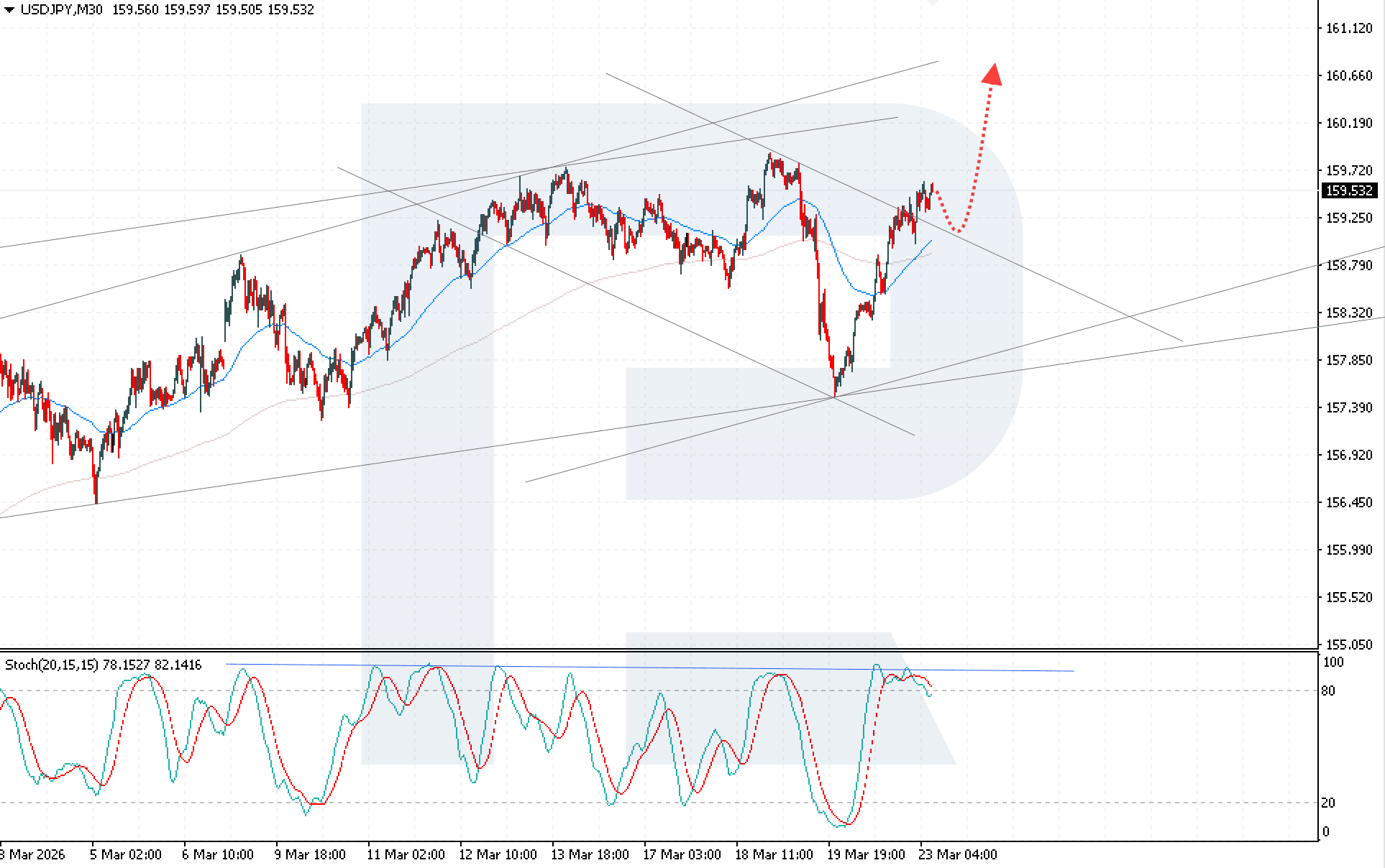 USDJPY жұбы өсуді жалғастырып, тұрақты инфляциялық күтулер аясында АҚШ доллары позицияларының нығаюын көрсетуде. Бағам қазіргі уақытта 159.53 деңгейінде. 2026 жылғы 23 наурыз арналған талдауымыздан толығырақ біліңіз.
