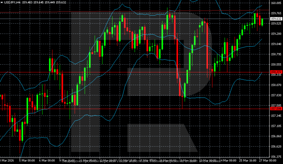 USDJPY жұбы жоғары трендте. 27 наурыз 2026 жылға арналған USDJPY болжамы 160.00 деңгейін тестілеуді және одан жоғары қозғалысты жоққа шығармайды.
