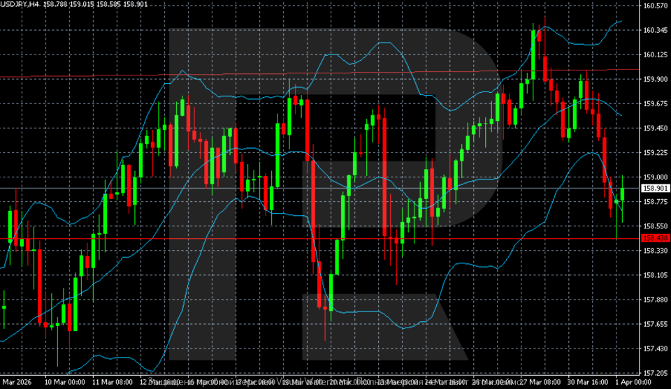 USDJPY жұбы төмендеп, кейін паузаға өтті, ал қазір назар сыртқы шиеленістің азаюына ауысты. Бүгінгі USDJPY болжамы 1 сәуір 2026 жыл үшін 158.50–160.00 диапазонында бүйірлік қозғалыстың жалғасуын жоққа шығармайды.