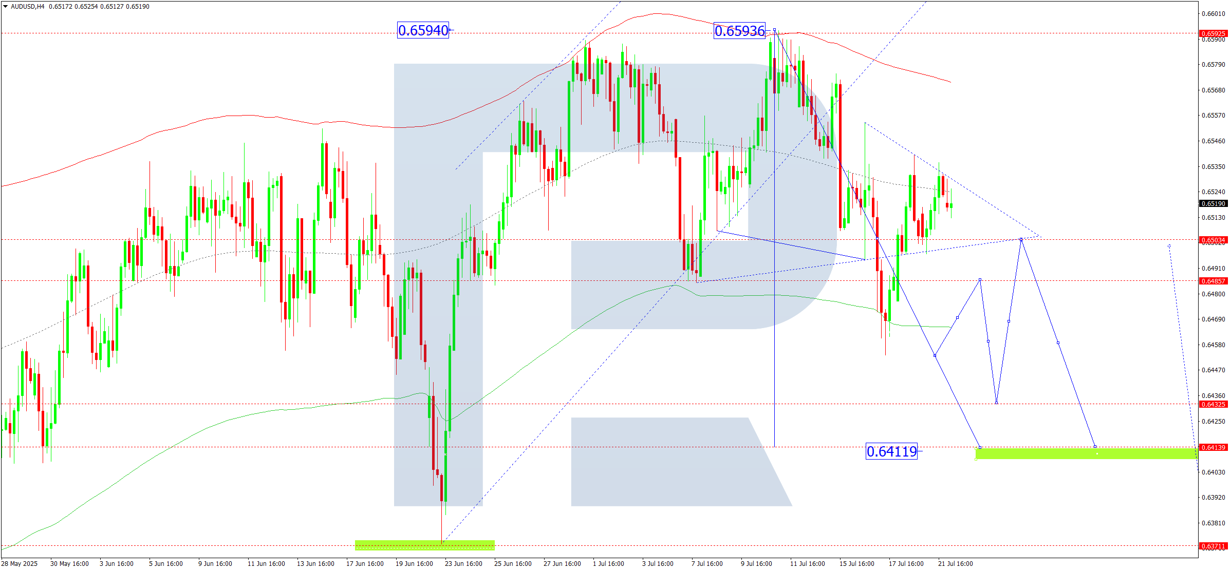 AUDUSD жұбының H4 графигінде нарық 0.6525 деңгейі маңында консолидация ауқымын дамытып жатыр. Бүгін, 2025 жылғы 22 шілдеде, толқын төмен бағытта 0.6484 деңгейіне дейін жалғасады деп күтілуде. Егер осы деңгейден төменге қарай бұзылса, тренд 0.6433 деңгейіне дейін кеңеюі мүмкін.
