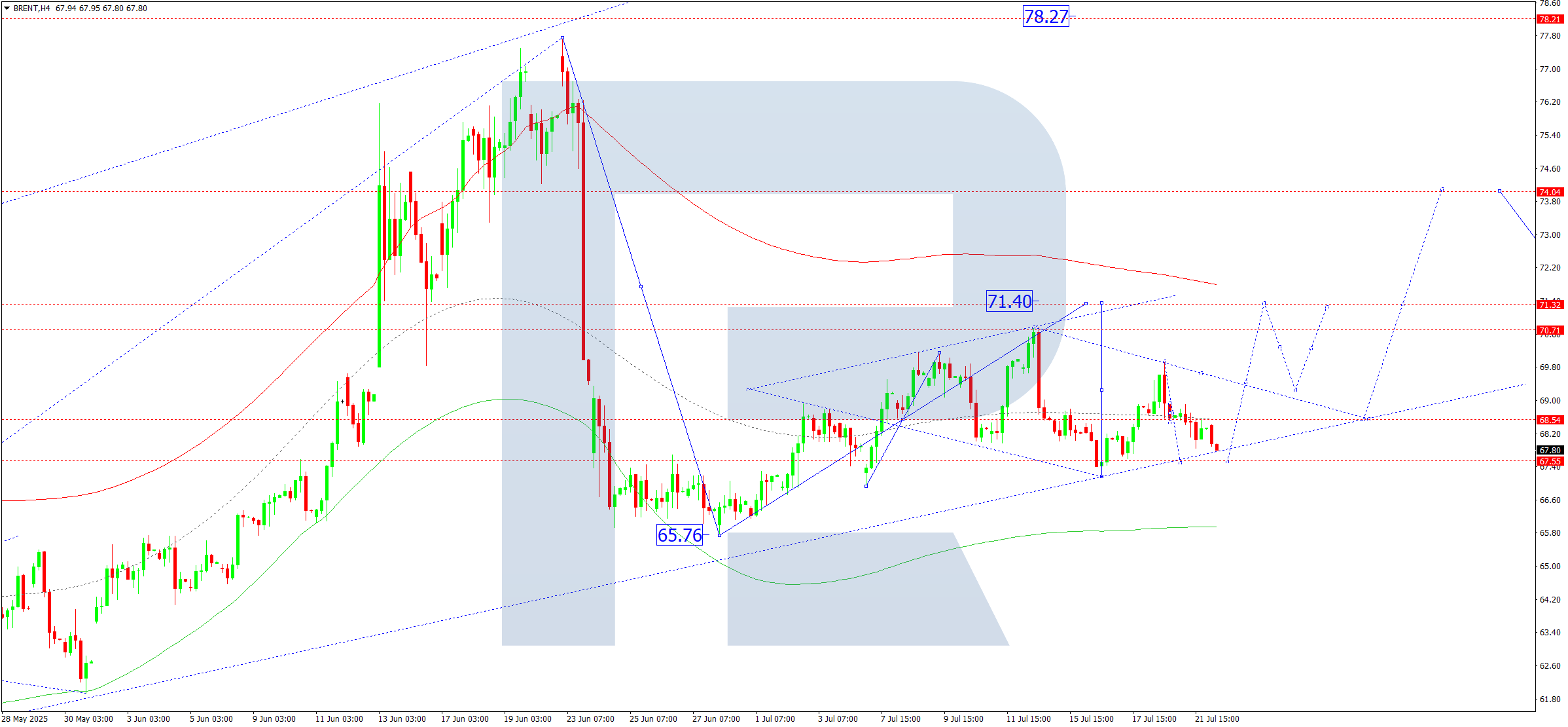 Brent мұнайының H4 графигінде нарық 68.60 деңгейі маңында консолидация ауқымын дамытып жатыр. Бүгін, 2025 жылғы 22 шілдеде, бұл ауқым төменге қарай 67.50 деңгейіне дейін кеңеюі мүмкін. Кейіннен 69.50 деңгейіне дейін жаңа өсу толқыны күтіледі. Егер жоғары қарай бұзылса, 71.40 деңгейіне дейін қозғалыс потенциалы ашылады. Егер төмен қарай бұзылса, ауқым 66.90 деңгейіне дейін кеңеюі мүмкін.