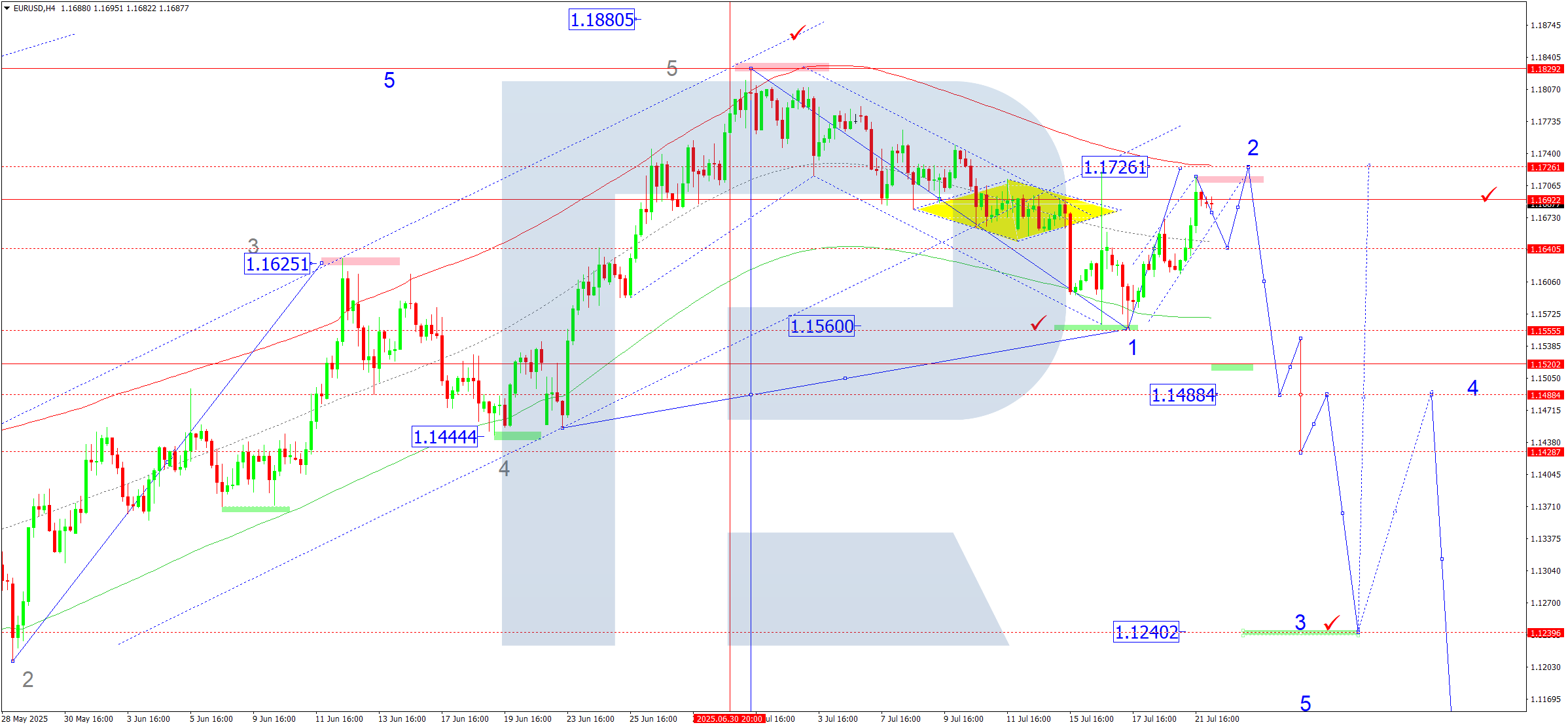 EURUSD жұбының H4 графигінде нарық 1.1640 деңгейі маңында консолидация ауқымын қалыптастырды және жоғары қарай бұзылғаннан кейін 1.1716 деңгейіне дейін түзету толқынын аяқтады. Бүгін, 2025 жылғы 22 шілдеде, нарық 1.1690 деңгейі маңында консолидация ауқымын құруда. Егер бұл деңгейден төменге бұзылса, 1.1640 деңгейіне дейін (жоғарыдан тестілеу) төмендеу болуы мүмкін. Осыдан кейін, 1.1726 деңгейіне дейін өсу толқыны жалғасуы ықтимал. Егер жоғары қарай бұзылса, толқын 1.1726 деңгейіне дейін жалғасуы мүмкін. Кейінірек жаңа төмендеу толқыны 1.1560 деңгейіне басталып, әрі қарай 1.1488 деңгейіне дейін кеңеюі мүмкін.