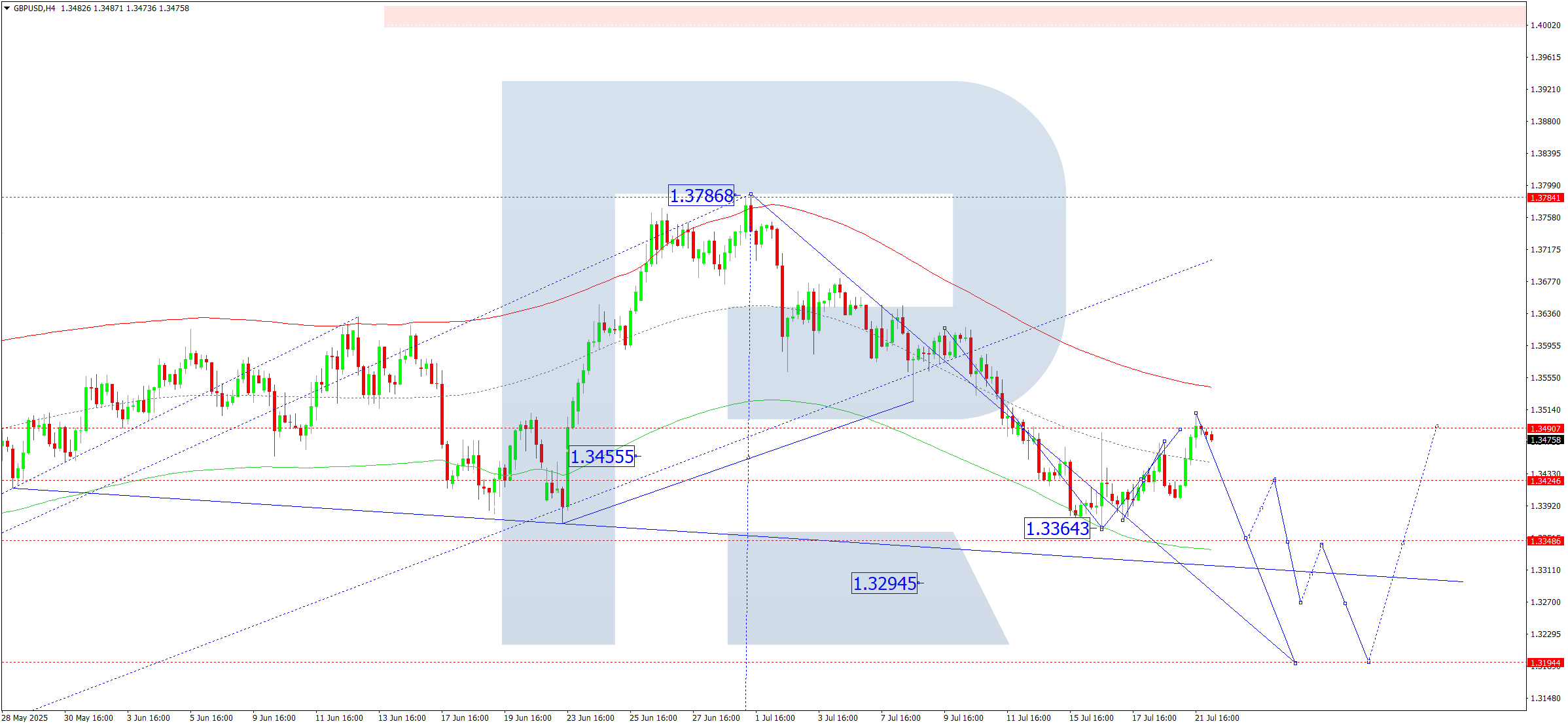 GBPUSD жұбының H4 графигінде нарық 1.3510 деңгейіне дейін түзету толқынын аяқтады. Бүгін, 2025 жылғы 22 шілдеде, нарық 1.3424 деңгейіне дейін төмендеуі мүмкін. Бұл деңгейден төменге бұзылса, тренд 1.3300 деңгейіне дейін төмендеуді жалғастырады. Кейіннен 1.3430 деңгейіне дейін түзету толқыны, әрі қарай 1.3295 деңгейіне дейін жаңа төмендеу күтіледі.