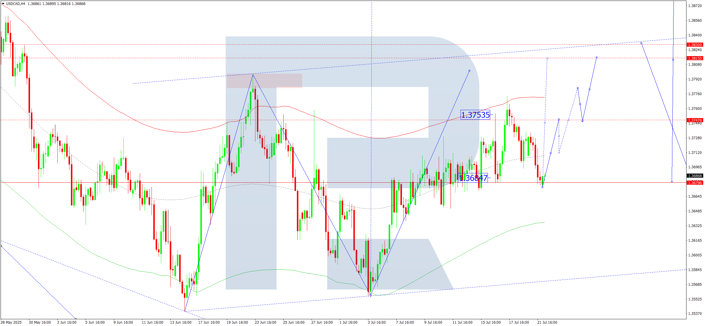USDCAD жұбының H4 графигінде нарық 1.3684 деңгейіне дейін төмендеу толқынын аяқтады. Бүгін, 2025 жылғы 22 шілдеде, жаңа өсу толқыны 1.3745 деңгейіне дейін дамиды деп күтілуде, әрі қарай трендтің 1.3815 деңгейіне дейін кеңею мүмкіндігі бар.