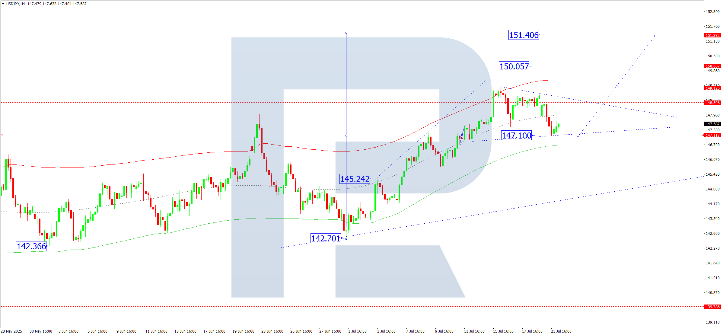 USDJPY жұбының H4 графигінде нарық 147.10 деңгейіне дейін түзету толқынын аяқтады. Бүгін, 2025 жылғы 22 шілдеде, жұп 148.50 деңгейіне дейін көтеріледі деп күтілуде. Егер осы деңгейден жоғары қарай бұзылса, тренд 150.05 деңгейіне дейін жалғасуы мүмкін. Осы деңгейге жеткеннен кейін, 147.10 деңгейіне дейін түзету толқыны күтіледі.