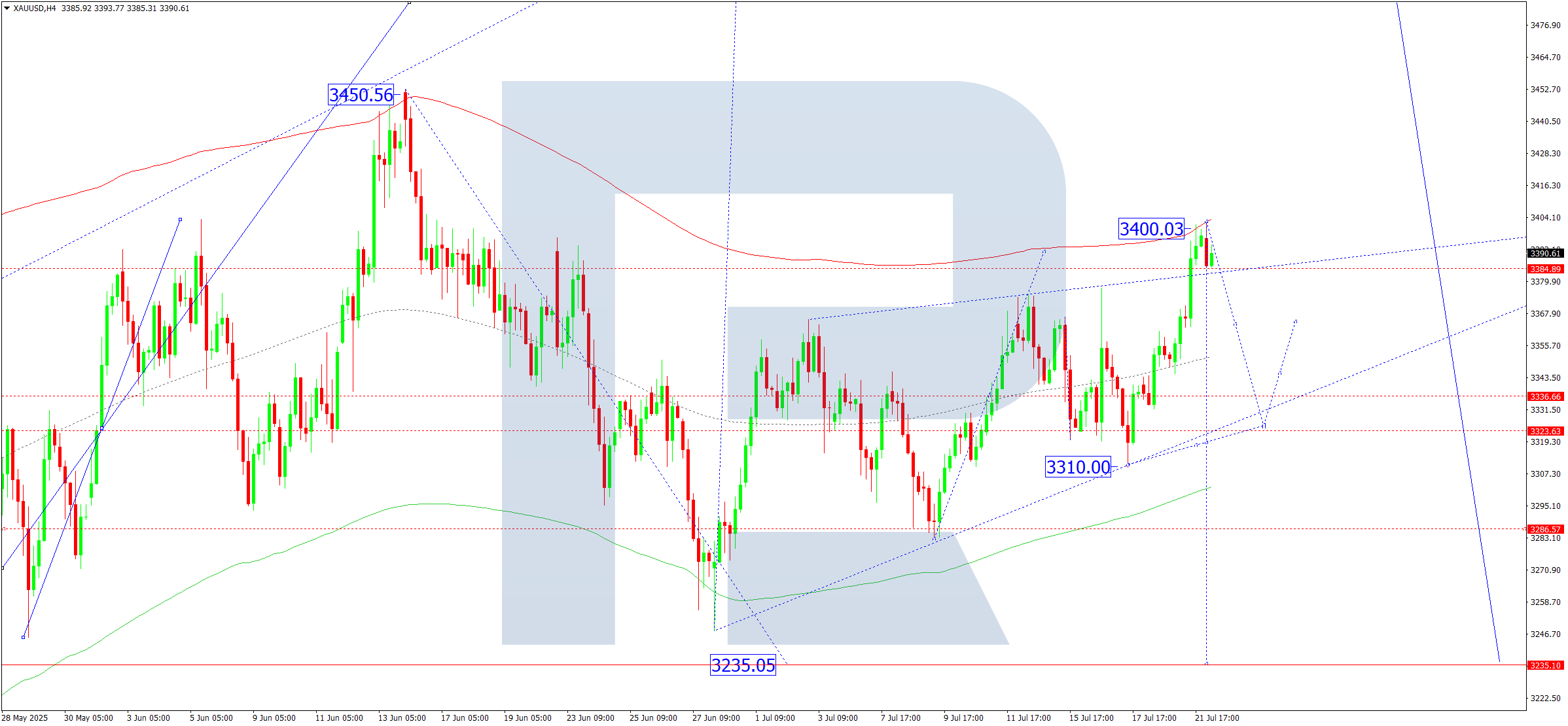 XAUUSD (алтын) жұбының H4 графигінде нарық 3,400 деңгейіне дейін өсу толқынын аяқтады. Бүгін, 2025 жылғы 22 шілдеде, нарық осы деңгей маңында консолидация ауқымын құрастыруда. Егер төменге қарай бұзылса, жаңа төмендеу толқыны 3,333 деңгейіне дейін басталады.