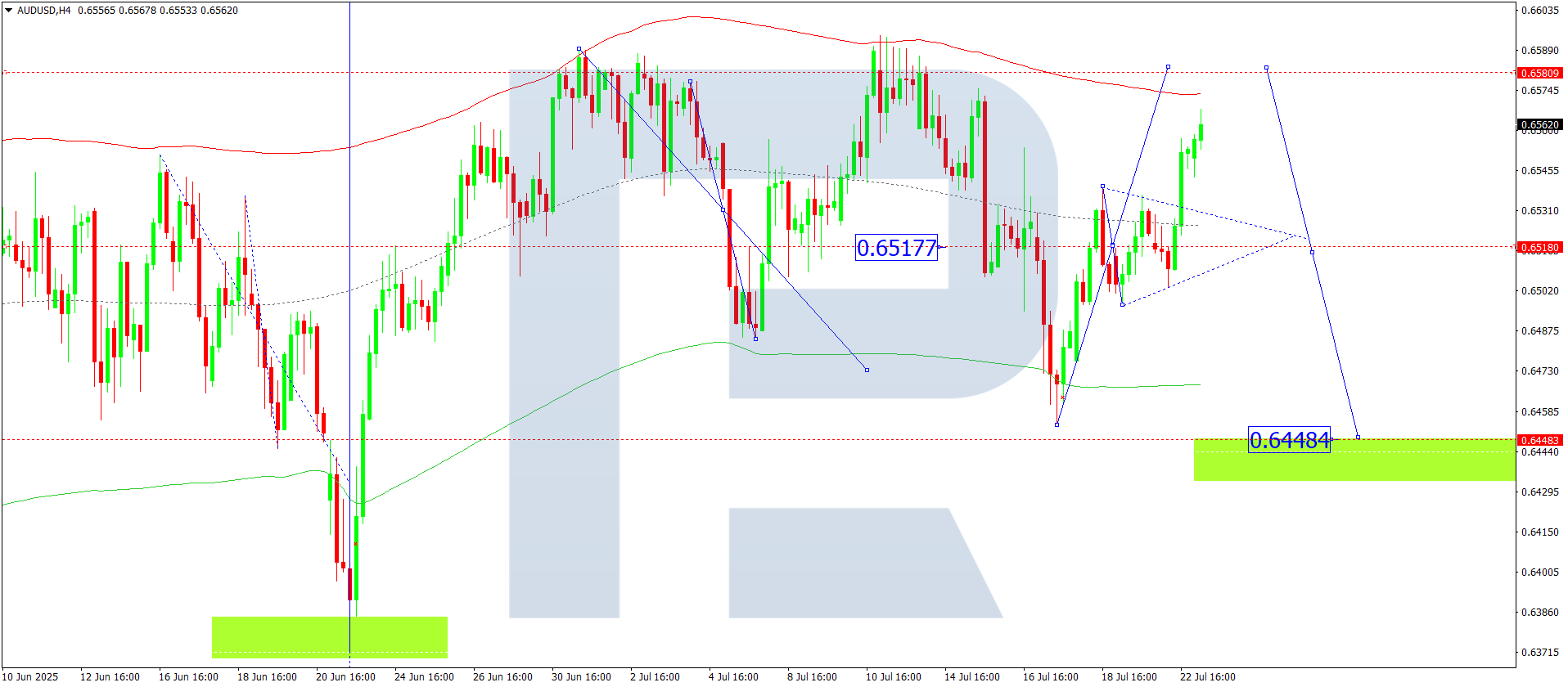 Техникалық тұрғыдан бұл сценарий Elliott толқын құрылымы және 0.6525 деңгейіндегі rotation centre белгіленген AUDUSD өсу толқыны матрицасымен расталады. Бұл деңгей – ағымдағы толқын құрылымындағы негізгі нүкте болып саналады. Қазіргі таңда нарық Price Envelope-тің төменгі шекарасы – 0.6454 деңгейіне дейін төмендеу толқынын құрастыруда. Кейін орталық сызық – 0.6500 деңгейіне дейін түзету, әрі қарай 0.6433 деңгейіне дейін жаңа төмендеу толқыны күтіледі.