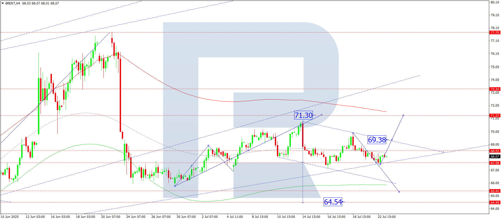 Brent мұнайының H4 графигінде нарық 68.60 деңгейі маңында консолидация ауқымын дамытып жатыр. Бүгін, 2025 жылғы 22 шілдеде, бұл ауқым төменге қарай 67.50 деңгейіне дейін кеңеюі мүмкін. Кейіннен 69.50 деңгейіне дейін жаңа өсу толқынының дамуы ықтимал. Егер жоғары қарай бұзылса, 71.40 деңгейіне дейін қозғалыс мүмкіндігі ашылады. Төмен қарай бұзылса, диапазон 66.90 деңгейіне дейін кеңеюі мүмкін.
