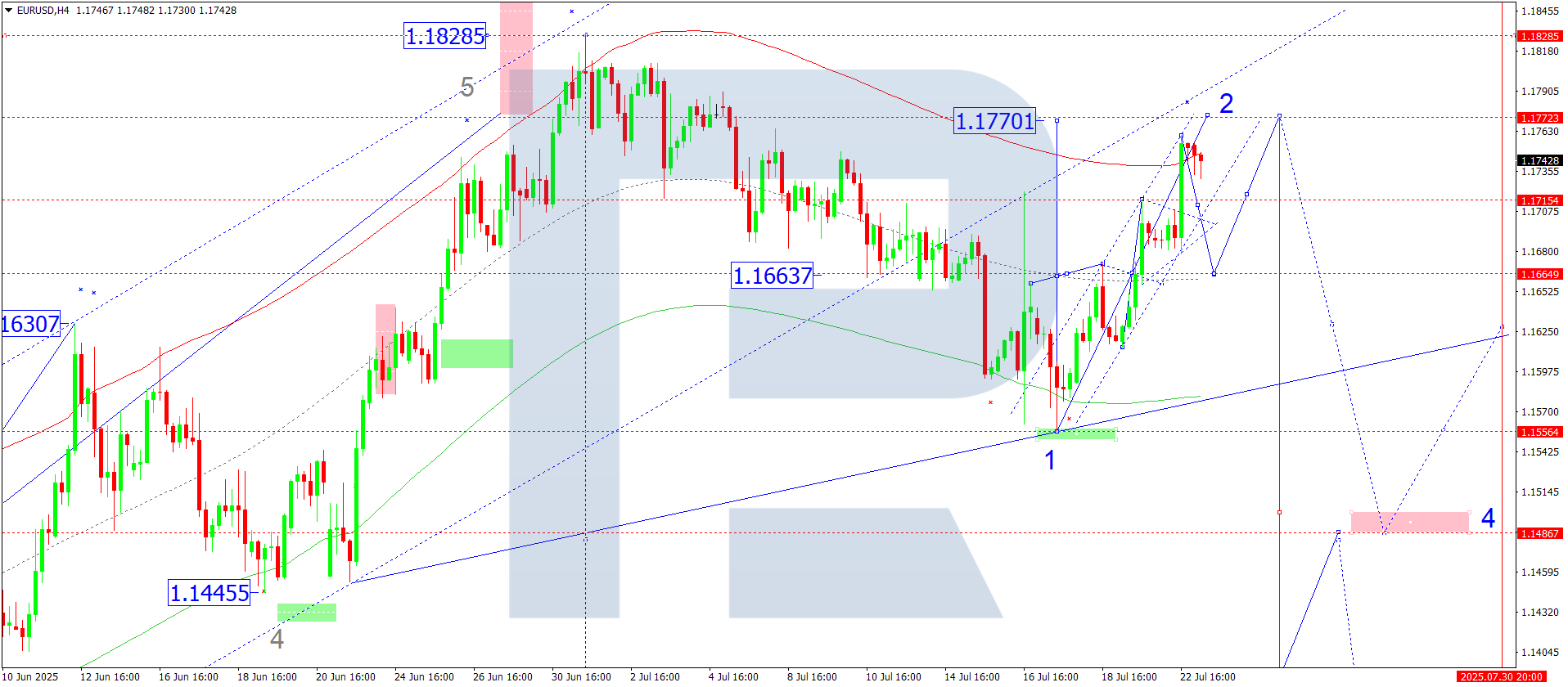 Техникалық тұрғыдан бұл сценарий көрсетілген Elliott толқын құрылымы және 1.1640 деңгейіндегі rotation centre белгіленген өсу толқыны матрицасымен қолдау табады. Бұл деңгей – EURUSD ағымдағы толқын құрылымындағы негізгі нүкте болып қалады. Нарық Price Envelope-тің жоғарғы шекарасы – 1.1726 деңгейіне дейін өсу толқынын жалғастырып жатыр. Кейінірек төмендеу толқыны Envelope орталық сызығы – 1.1640 бағытында қалыптасуы мүмкін.