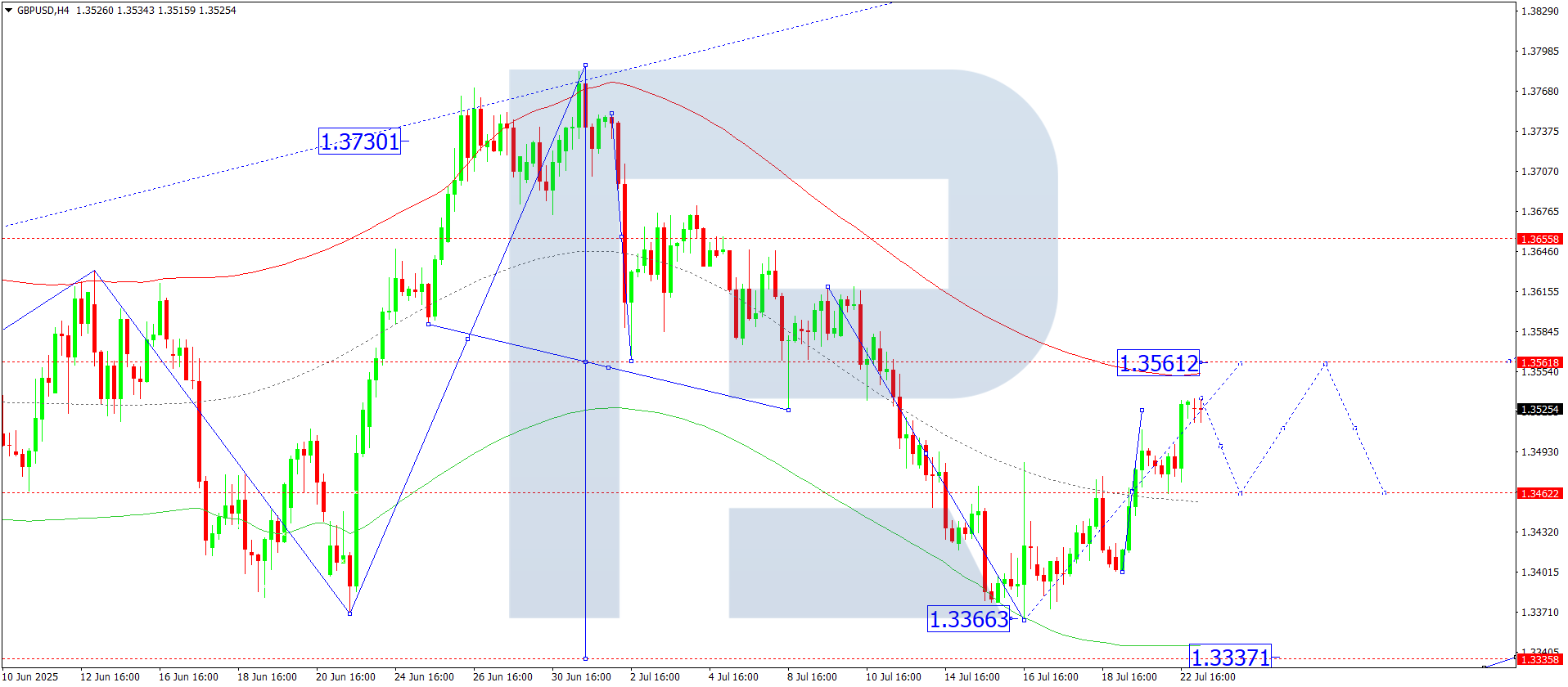Техникалық тұрғыдан бұл сценарий Elliott толқын құрылымы және 1.3455 деңгейіндегі rotation centre белгіленген төмен бағыттағы толқын матрицасымен қолдау табады. Бұл – ағымдағы толқын құрылымындағы негізгі деңгей. Қазіргі таңда нарық Price Envelope-тің орталық сызығы – 1.3430 деңгейі маңында консолидация ауқымын қалыптастыруда. 1.3340 деңгейіндегі төменгі шекараға дейін төмендеу күтіледі, әрі қарай 1.3295 деңгейіне дейін кеңею ықтимал.
