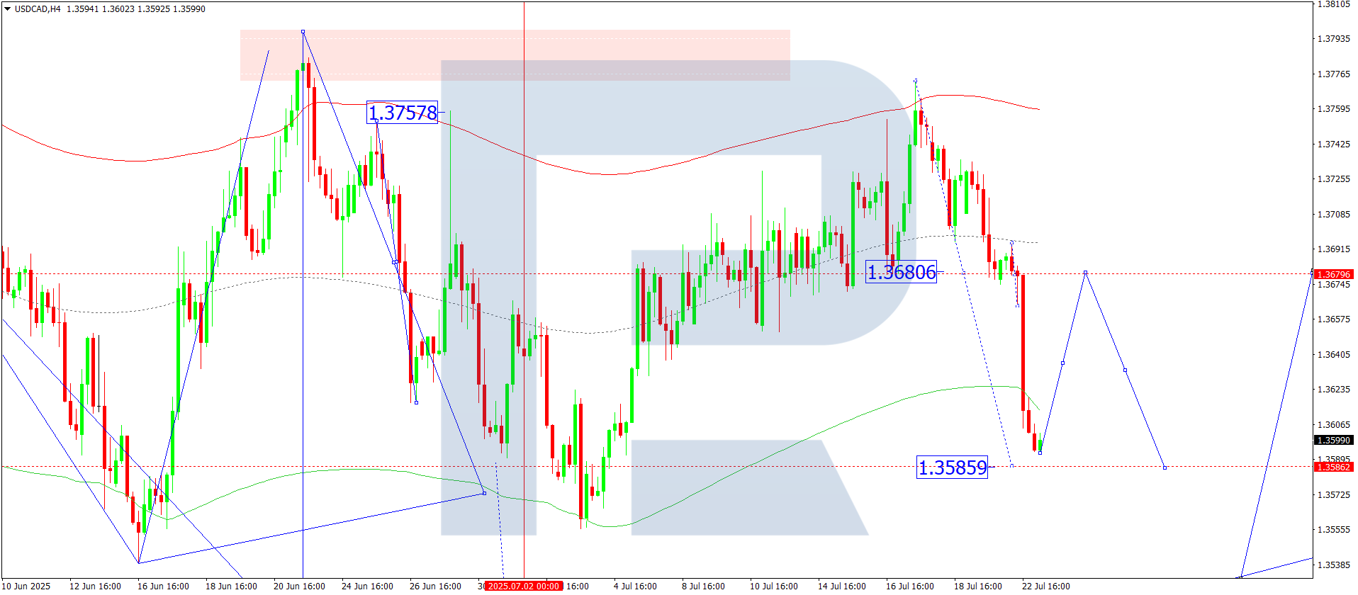 USDCAD жұбының H4 графигінде нарық 1.3684 деңгейіне дейін төмендеу толқынын аяқтады. Бүгін, 2025 жылғы 22 шілдеде, 1.3745 деңгейіне дейін жаңа өсу толқыны дамиды деп күтілуде. Сонымен қатар, трендтің әрі қарай 1.3815 деңгейіне дейін кеңею ықтималдығы бар.