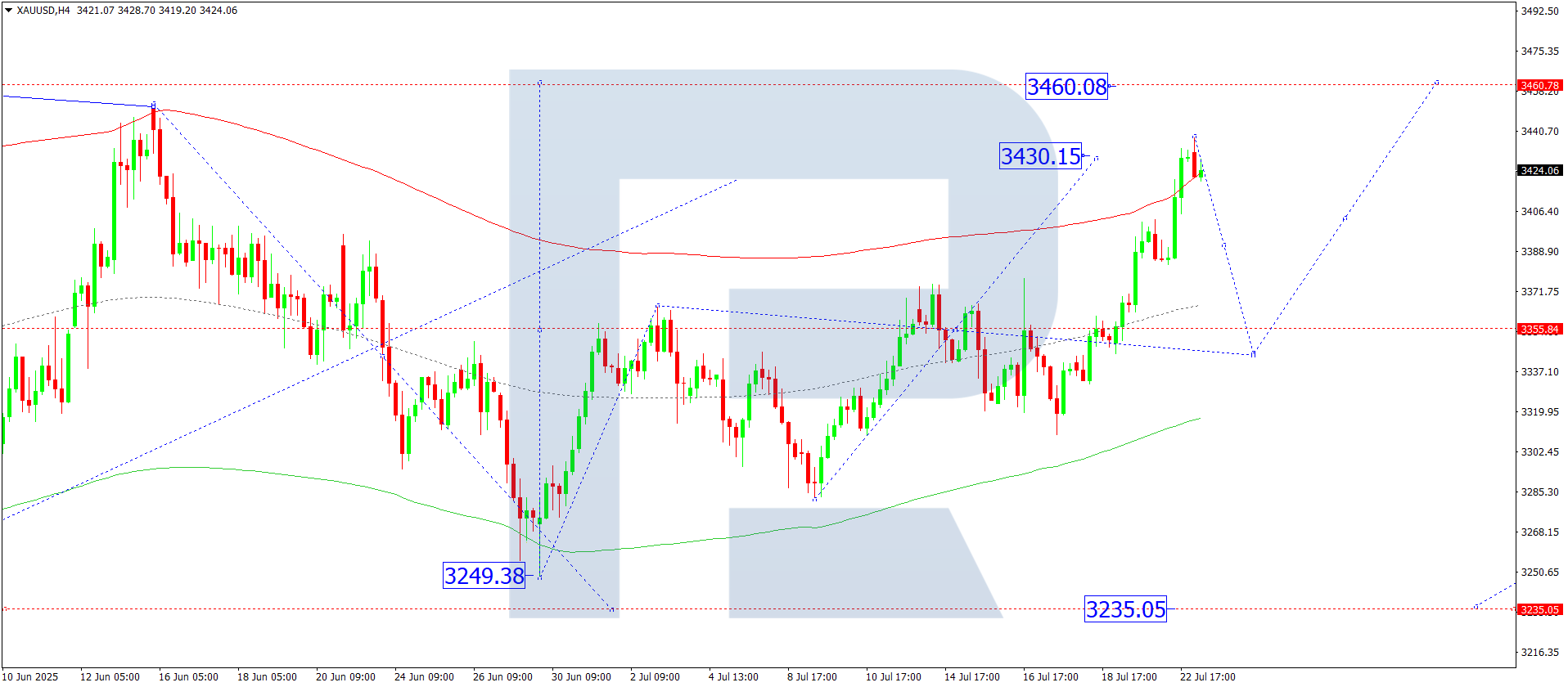 XAUUSD (алтын) жұбының H4 графигінде нарық 3,400 деңгейіне дейін өсу толқынын аяқтады. Бүгін, 2025 жылғы 22 шілдеде, нарық осы деңгей маңында консолидация ауқымын қалыптастыруда. Егер төменге қарай бұзылса, жаңа төмендеу толқыны 3,333 деңгейіне дейін басталады.