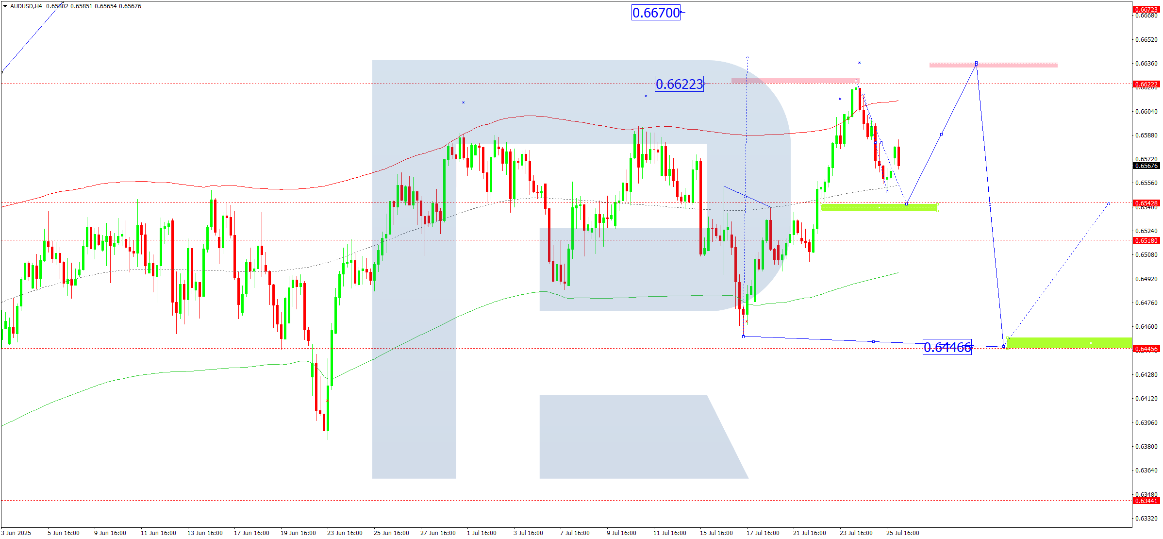 AUDUSD жұбының H4 графигінде нарық 0.6540 деңгейіне қарай төмендеу толқынын қалыптастыруда. Бүгін, 2025 жылғы 28 шілдеде, осы мақсатты деңгейге жетеді деп күтілуде. Кейін 0.6580 деңгейіне дейін қайта көтерілу ықтимал. Қазіргі таңда баға 0.6580 деңгейі маңында консолидациялануда.