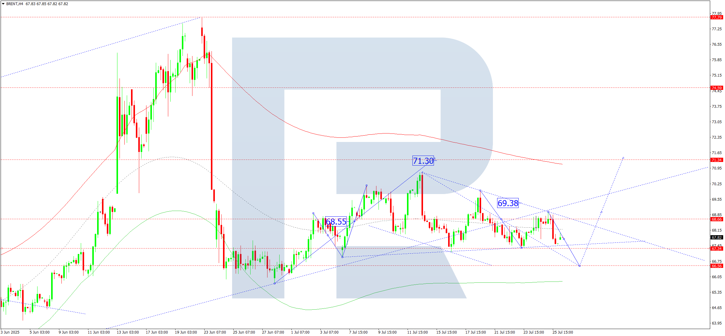 Brent маркалы мұнайдың H4 графигінде нарық 68.55 деңгейі маңында трендсіз консолидацияны жалғастыруда. Бүгін, 2025 жылғы 28 шілдеде, диапазон 66.55 деңгейіне дейін кеңеюі мүмкін. Кейін 68.38 деңгейіне дейін өсу толқыны басталуы ықтимал. Егер осы деңгей бұзылса, толқын кемінде 71.30 деңгейіне дейін жалғасуы мүмкін.