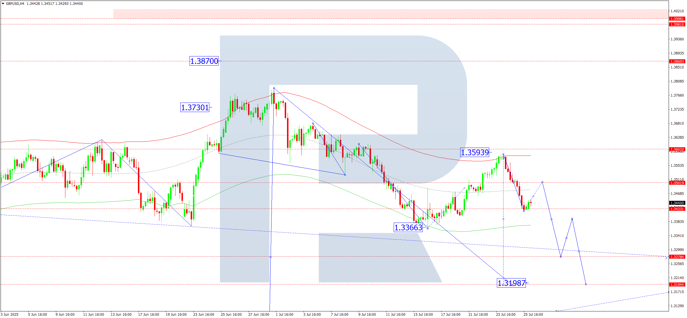 GBPUSD жұбының H4 графигінде нарық 1.3424 деңгейіне дейін төмендеу толқынын аяқтады. Бүгін, 2025 жылғы 28 шілдеде, баға 1.3500 деңгейіне дейін көтерілуі мүмкін. Кейін төмендеу толқыны жергілікті мақсат ретінде 1.3280 деңгейіне дейін жалғасуы ықтимал.