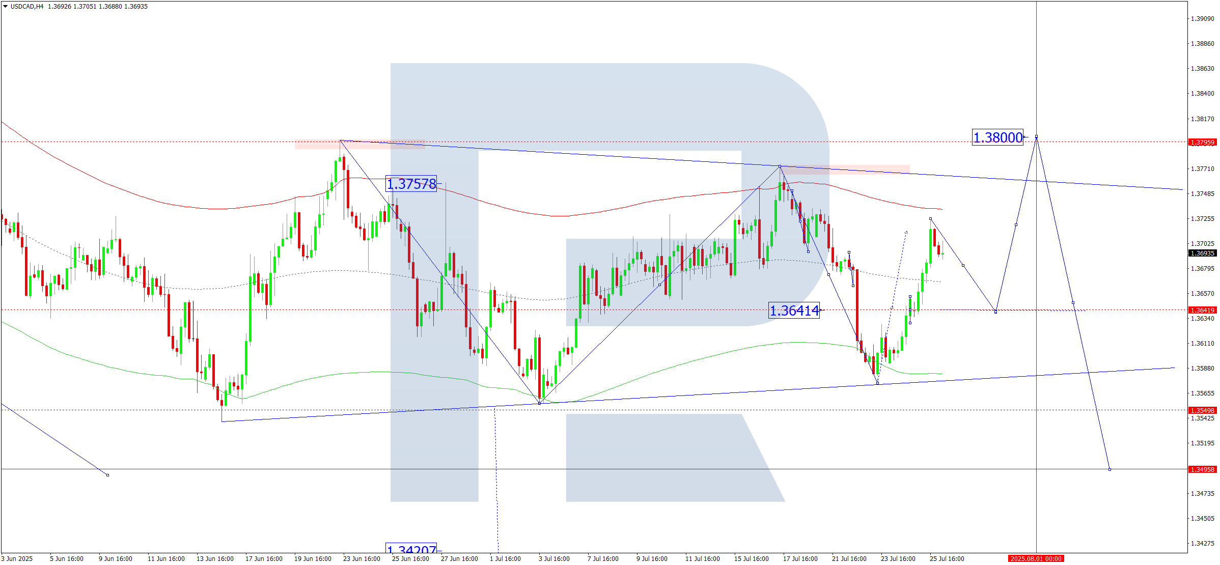 USDCAD жұбының H4 графигінде нарық 1.3725 деңгейіне дейін өсім импульсын аяқтады. Бүгін, 2025 жылғы 28 шілдеде, 1.3646 деңгейіне дейін кері шегіну күтіледі. Кейін жаңа өсу толқыны басталып, 1.3800 деңгейіне дейін жалғасуы ықтимал.