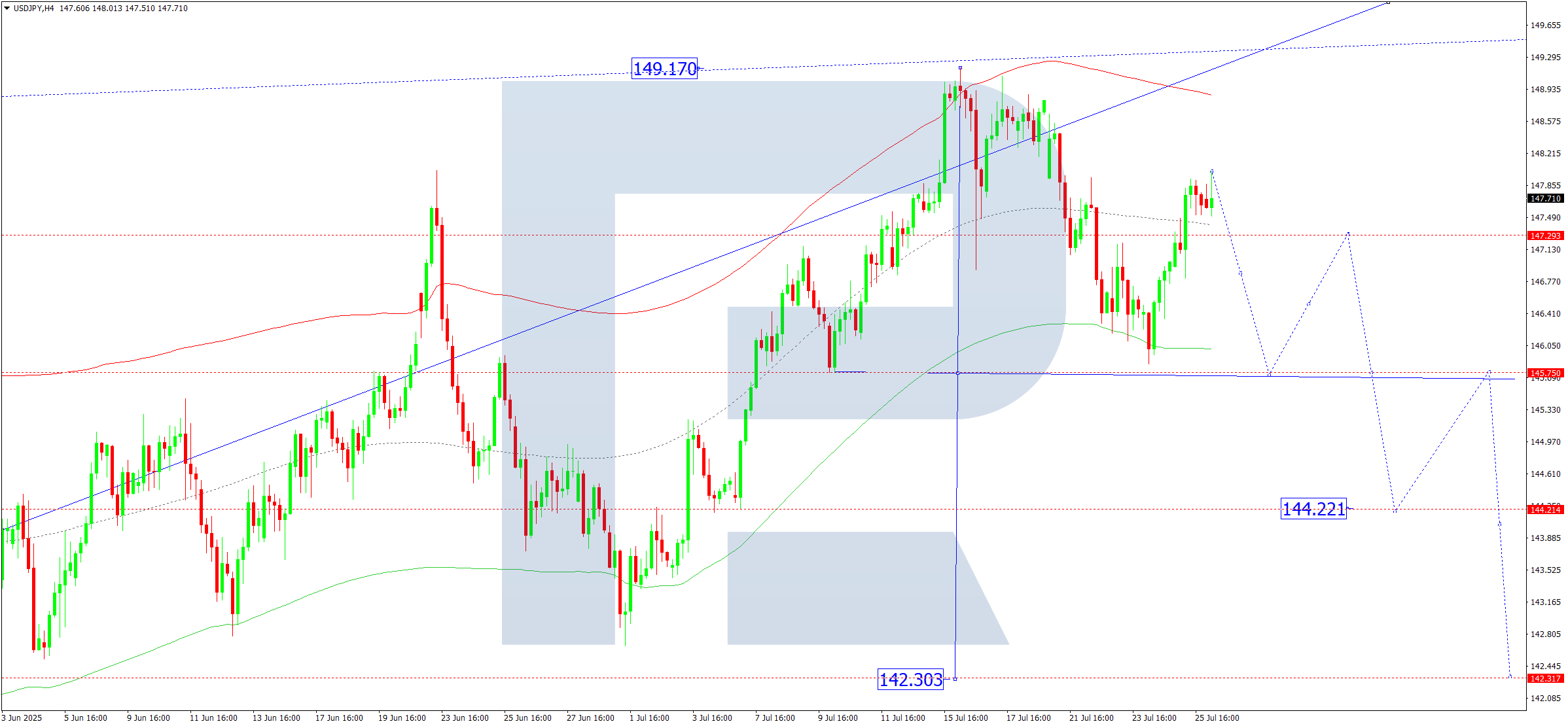 USDJPY жұбының H4 графигінде нарық 148.00 деңгейіне дейін түзету толқынын аяқтады. Бүгін, 2025 жылғы 28 шілдеде, баға 145.75 деңгейіне дейін төмендеуі мүмкін, әрі қарай тренд 144.22 деңгейіне дейін жалғасуы ықтимал.