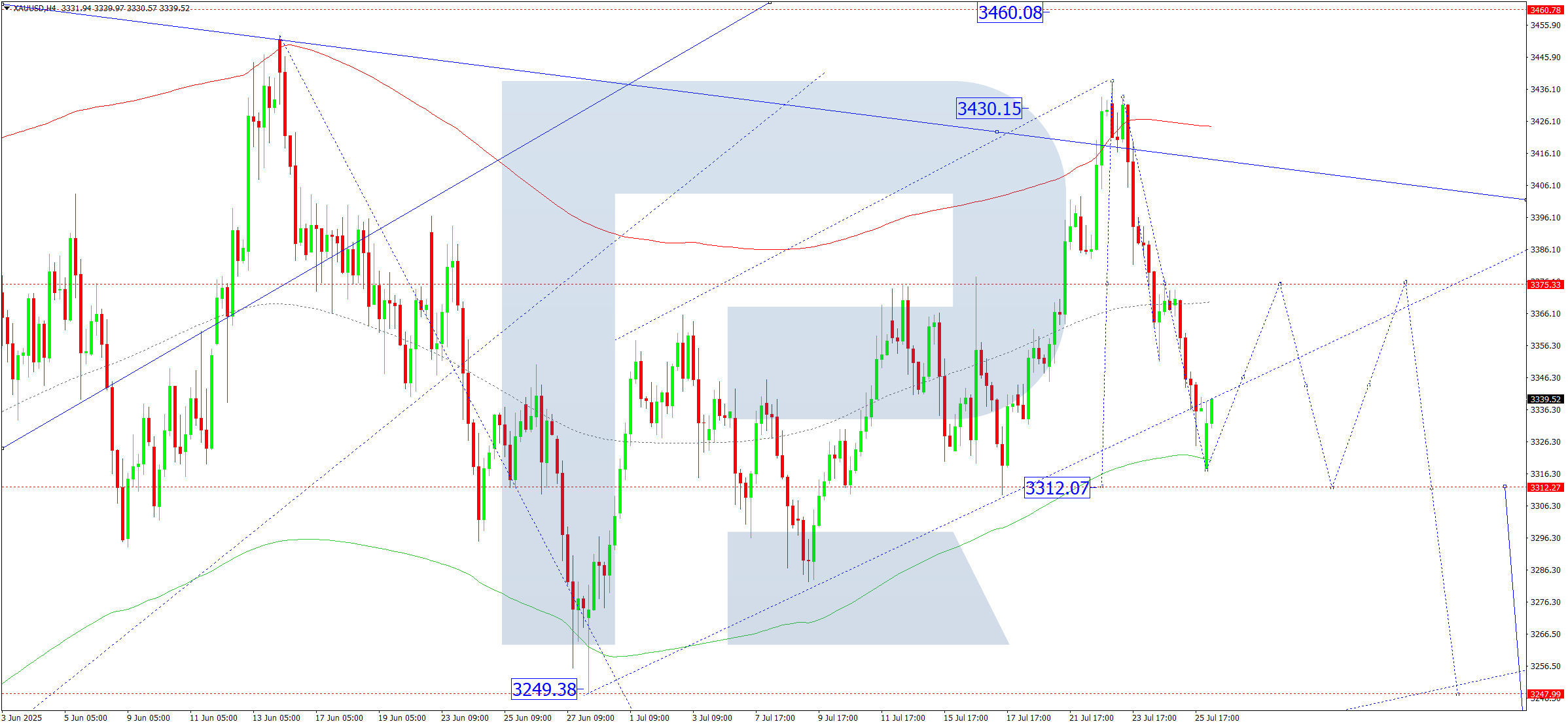 XAUUSD жұбының H4 графигінде нарық 3,318 деңгейіне қарай төмендеу толқынын дамытуды жалғастыруда. Бүгін, 2025 жылғы 28 шілдеде, жаңа өсу толқыны 3,375 деңгейіне қарай басталуы мүмкін. Кейін 3,312 деңгейіне дейін тағы бір қысқа мерзімді төмендеу ықтимал.