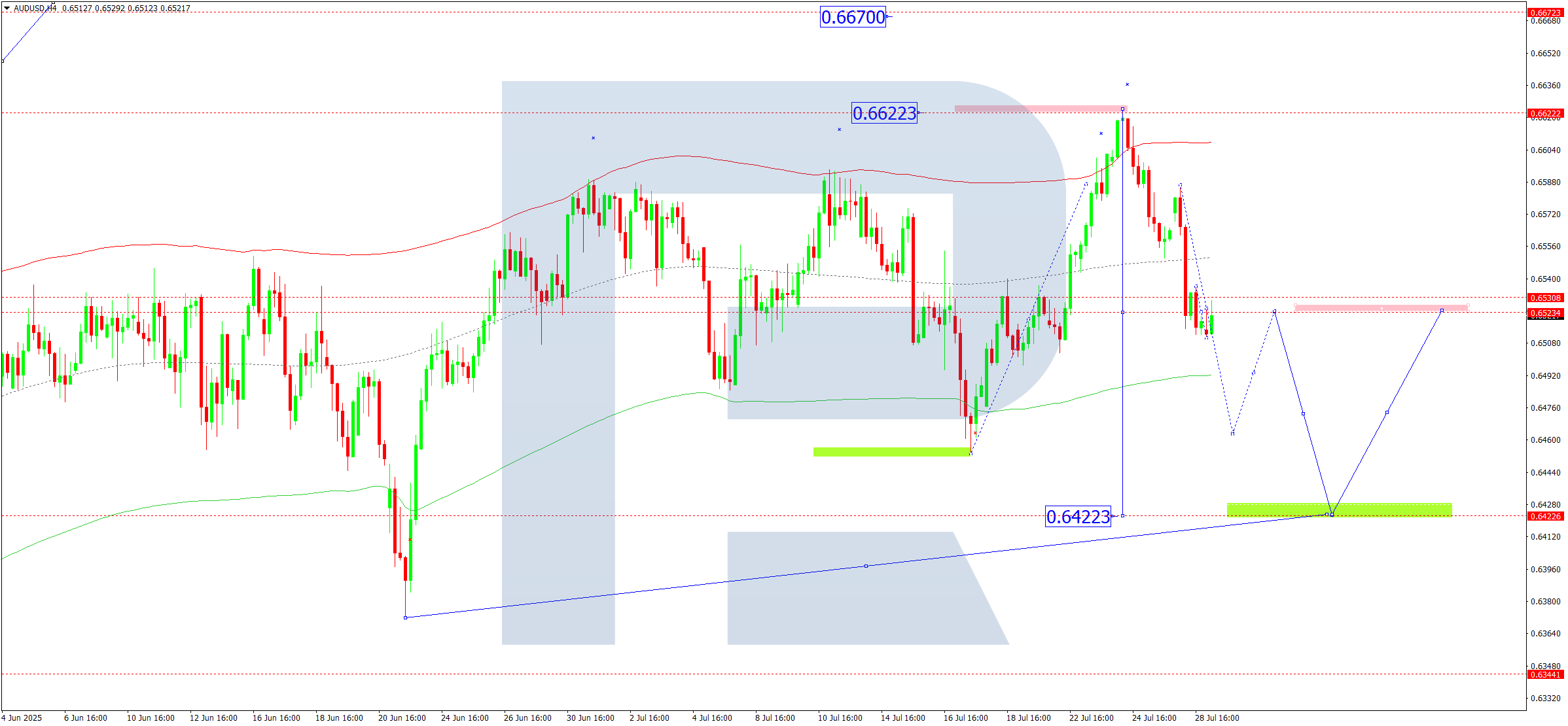 AUDUSD жұбының H4 графигінде нарық 0.6520 деңгейіне дейін төмендеу толқынын аяқтады. Бүгін, 2025 жылғы 29 шілдеде, осы деңгейден жоғары консолидация диапазоны қалыптасуы мүмкін. Егер баға төмен бұзылса, толқын 0.6470 деңгейіне дейін жалғасып, әрі қарай 0.6422 деңгейіне дейін созылуы мүмкін.