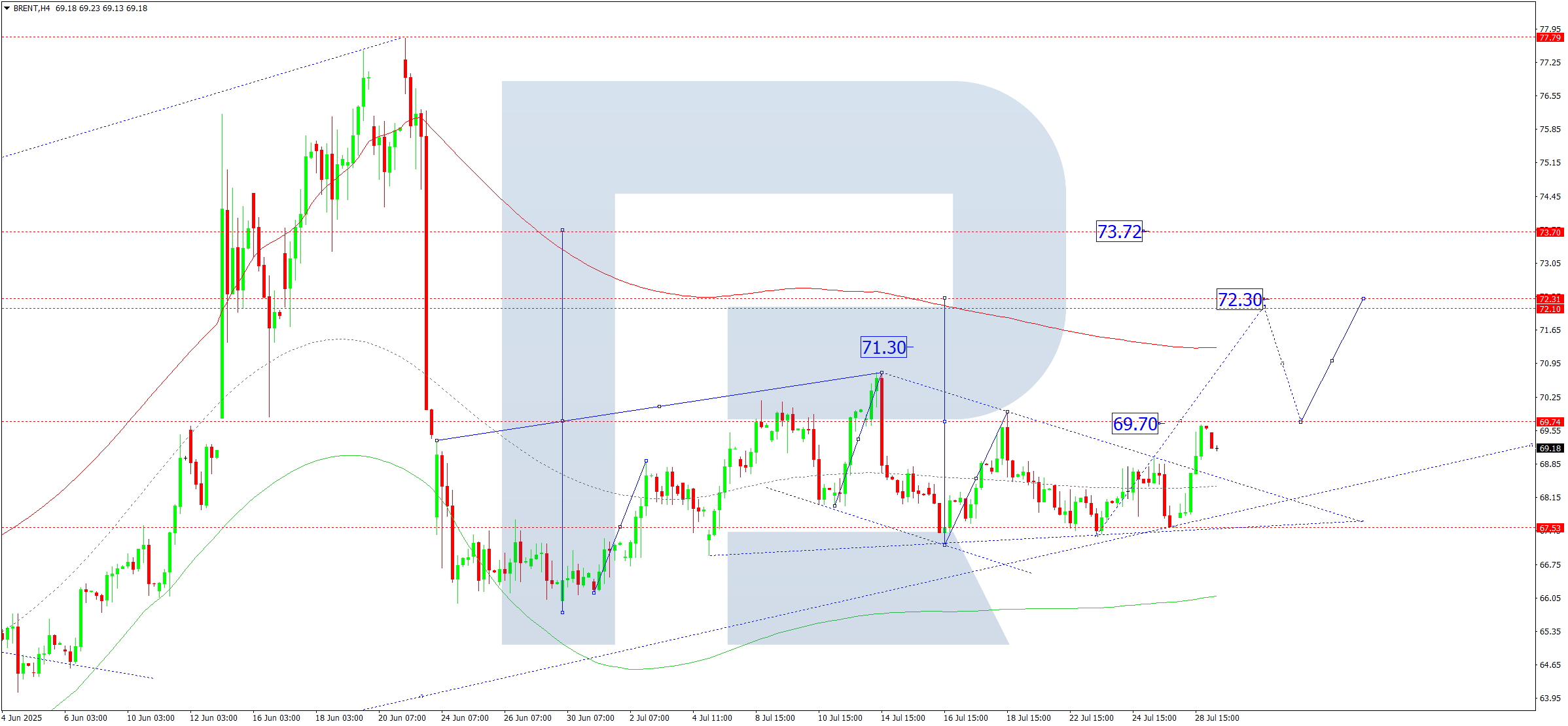 Brent маркалы мұнайдың H4 графигінде нарық 69.55 деңгейіне дейін өсу толқынын аяқтады. Бүгін, 2025 жылғы 29 шілдеде, осы деңгейден төмен консолидация диапазоны құрылуы мүмкін. Егер баға жоғары бұзылып шықса, толқын 71.30 деңгейіне дейін жалғасып, әрі қарай жергілікті мақсат ретінде 72.30 деңгейіне дейін көтерілуі мүмкін.