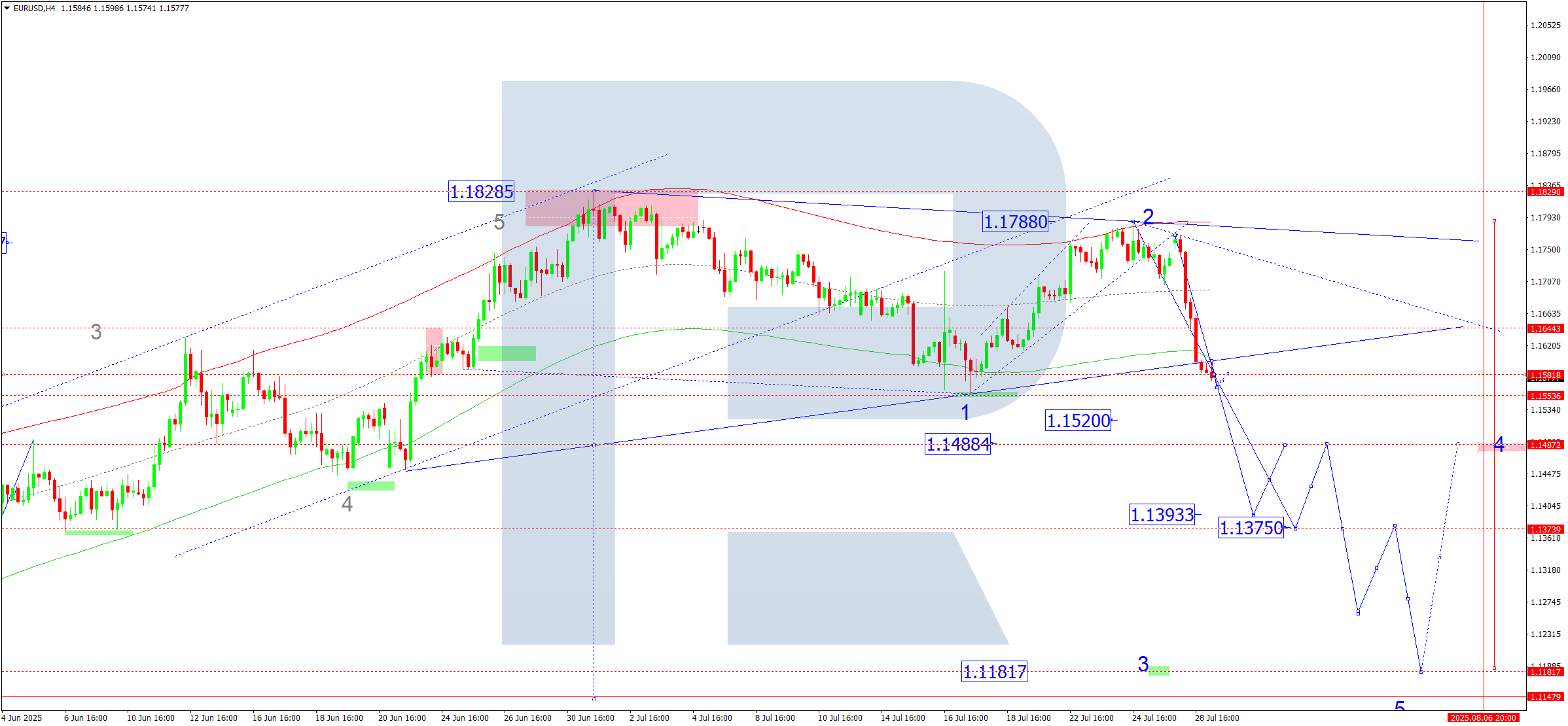 EURUSD жұбының H4 графигінде нарық екінші төмендеу импульсын дамытуды жалғастыруда. Бүгін, 2025 жылғы 29 шілдеде, баға 1.1574 деңгейіне дейін төмендеді. Қазір 1.1580 маңында тар консолидация диапазоны қалыптасып жатыр. Бұл деңгей төмен бұзылса, төмендеу толқыны 1.1393 деңгейіне дейін жалғасып, әрі қарай 1.1181 деңгейіне дейін созылуы мүмкін.