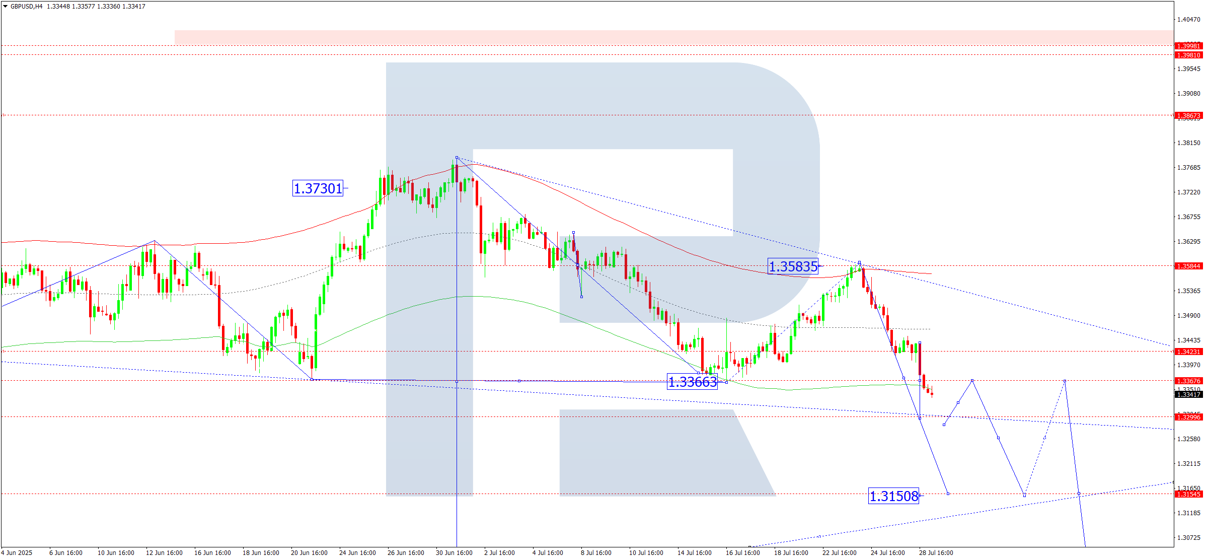 GBPUSD жұбының H4 графигінде нарық 1.3423 деңгейі маңында консолидацияланғаннан кейін төмен қарай бұзылып шықты. Бүгін, 2025 жылғы 29 шілдеде, төмендеу 1.3260 деңгейіне дейін жалғасуы мүмкін. Бұл – жергілікті мақсат. 1.3366 деңгейіне дейін (төменнен тестілеу) қайтар мүмкіндігі де бар, кейіннен 1.3150 деңгейіне дейін қайта төмендеу болуы ықтимал.