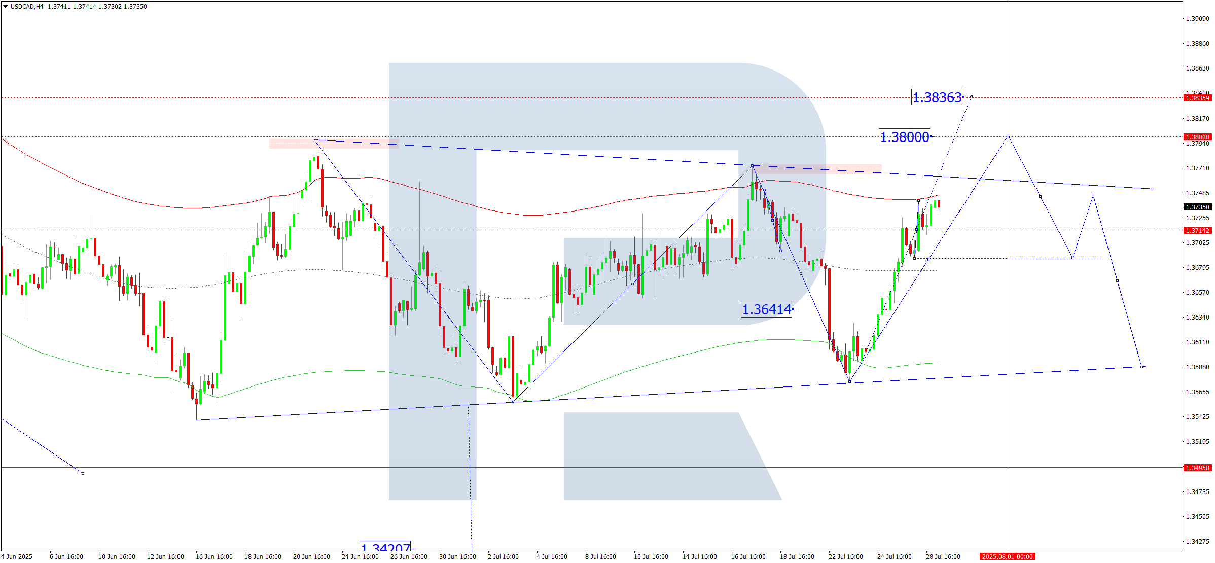 USDCAD жұбының H4 графигінде нарық 1.3714 деңгейі маңында консолидация аясын құруда. Бүгін, 2025 жылғы 29 шілдеде, жоғары бұзылып, 1.3800 деңгейіне қарай қозғалу мүмкін, әрі қарай толқын 1.3836 деңгейіне дейін созылуы ықтимал.