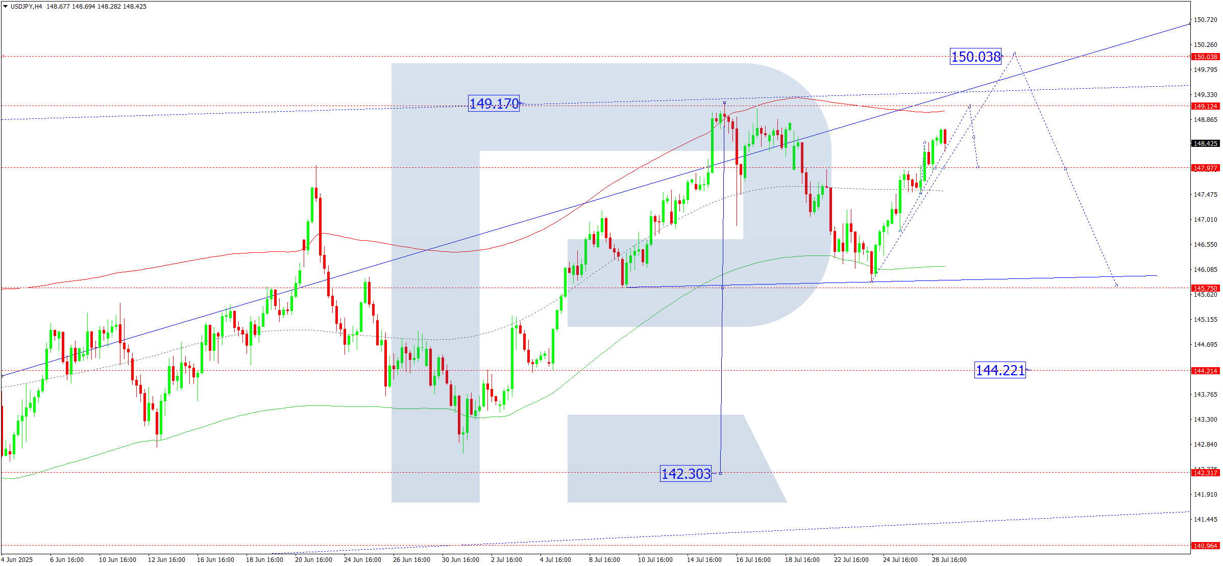 USDJPY жұбының H4 графигінде нарық 148.00 деңгейі маңында консолидациялануда. Бүгін, 2025 жылғы 29 шілдеде, өсу толқыны 149.17 деңгейіне дейін жалғасуы мүмкін, әрі қарай 150.00 деңгейі мақсат ретінде қарастырылуда.