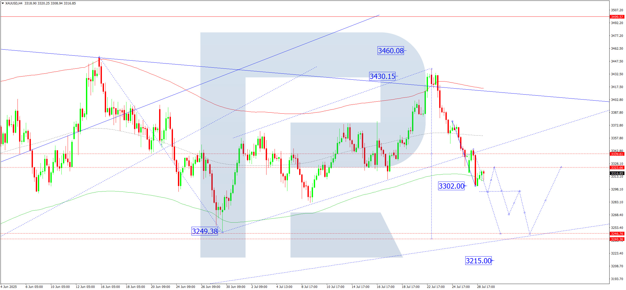 XAUUSD жұбының H4 графигінде нарық 3,302 деңгейіне дейін төмендеу толқынын аяқтады. Бүгін, 2025 жылғы 29 шілдеде, бағаның 3,323 деңгейіне дейін көтерілуі жоққа шығарылмайды, кейін төмендеу 3,246 деңгейіне дейін жалғасуы мүмкін.