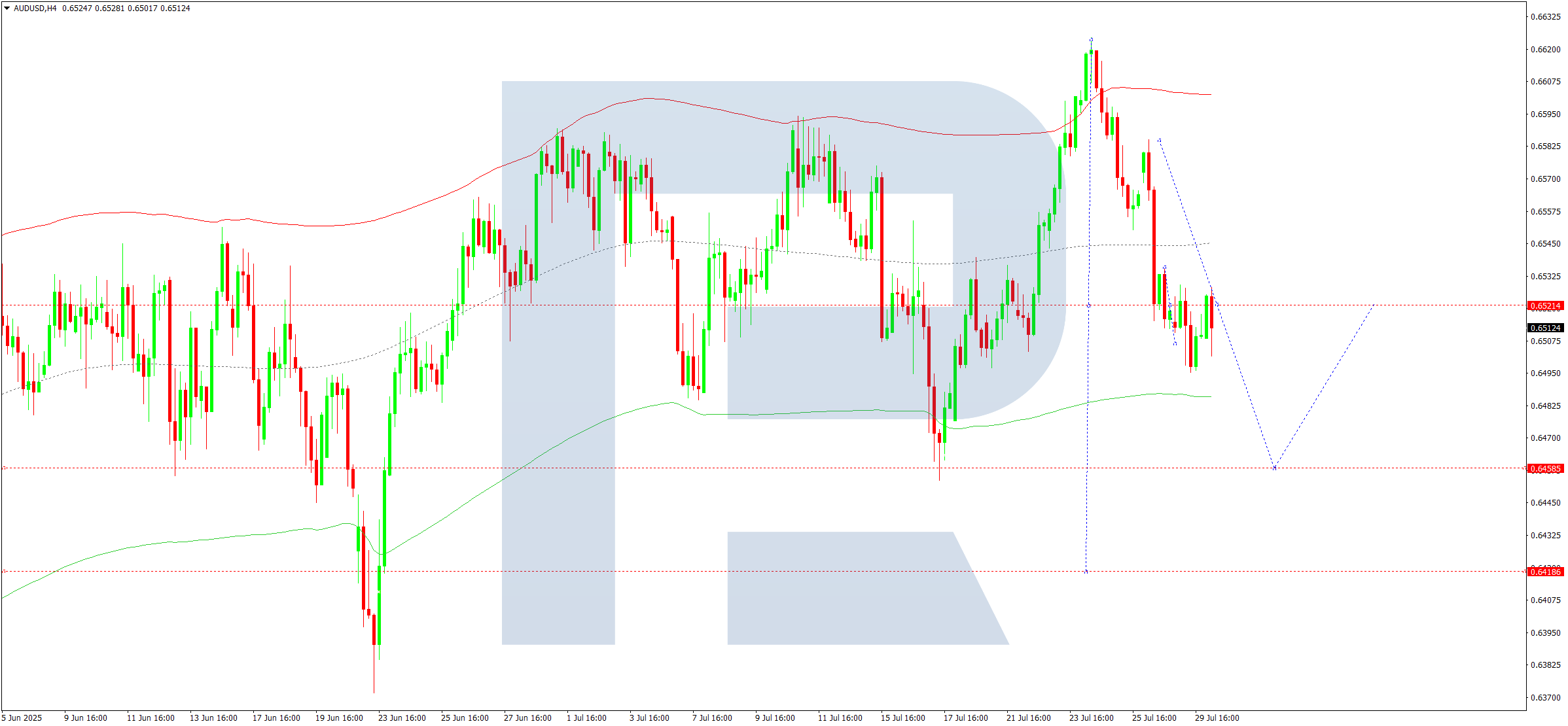 AUDUSD жұбының H4 графигінде нарық 0.6520 деңгейі маңында консолидация диапазонын құруда. Бүгін, 2025 жылғы 30 шілдеде, 0.6460 деңгейіне дейін төменге бұзылу күтіледі, әрі қарай тренд 0.6420 деңгейіне дейін жалғасуы мүмкін.