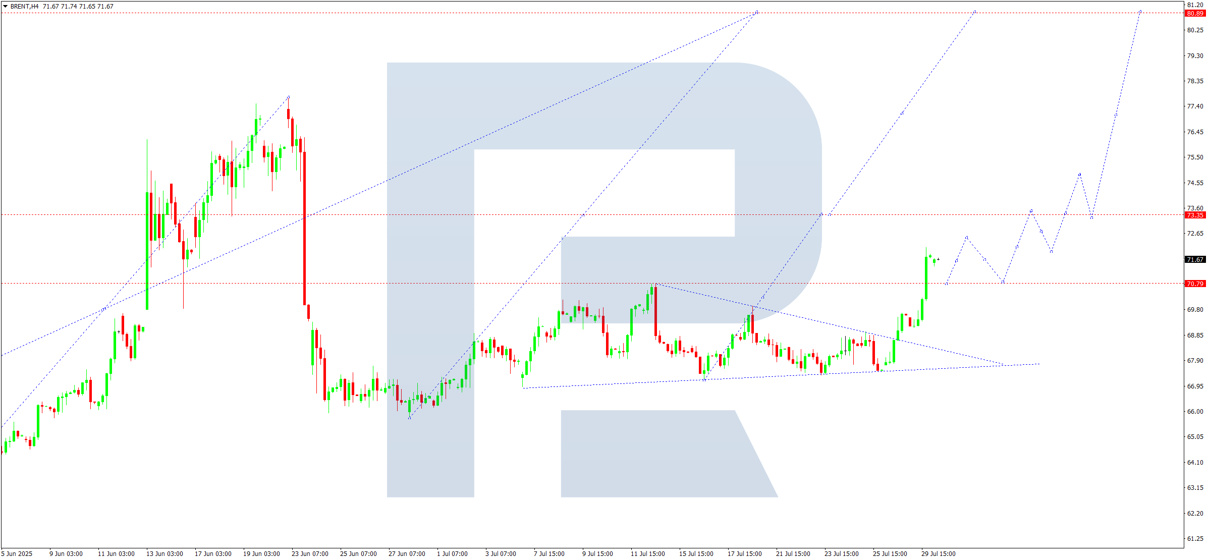 Brent маркалы мұнайдың H4 графигінде нарық 72.13 деңгейіне дейін өсу толқынын аяқтады. Бүгін, 2025 жылғы 30 шілдеде, осы деңгейден төмен консолидация диапазоны құрылуы мүмкін. Егер баға жоғарыға бұзылса, 72.50 және әрі қарай 73.33 деңгейіне дейін өсу жалғасуы ықтимал.