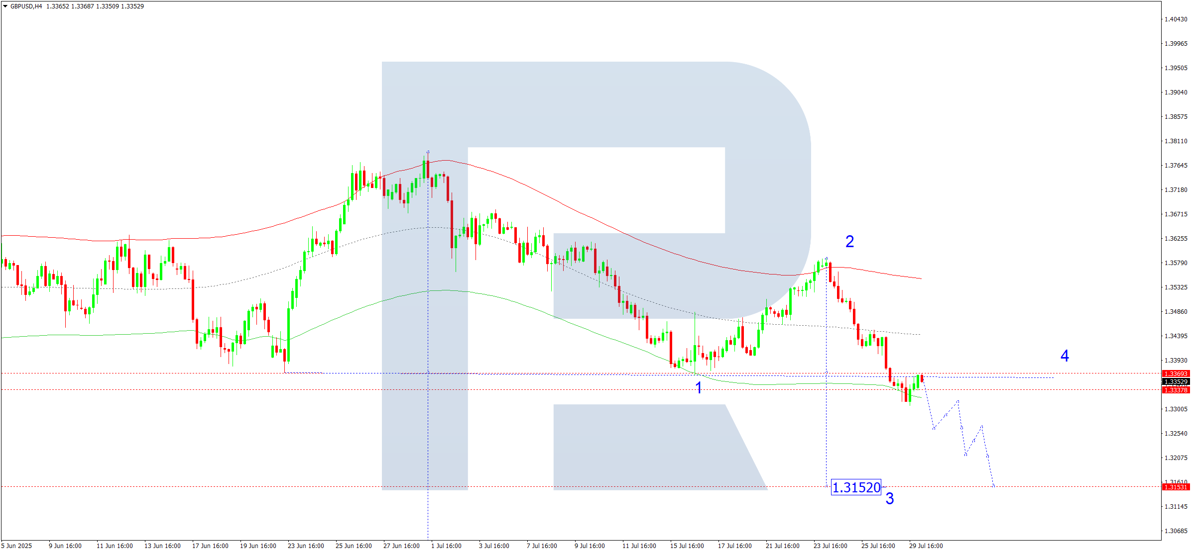Техникалық жағынан бұл сценарий 1.3370 бұрылу нүктесімен белгіленген Elliott толқын құрылымы мен төмендеу толқыны матрицасымен расталады. Нарық қазіргі уақытта 1.3260 деңгейіндегі Price Envelope-тің төменгі шекарасына бағыт алуда.