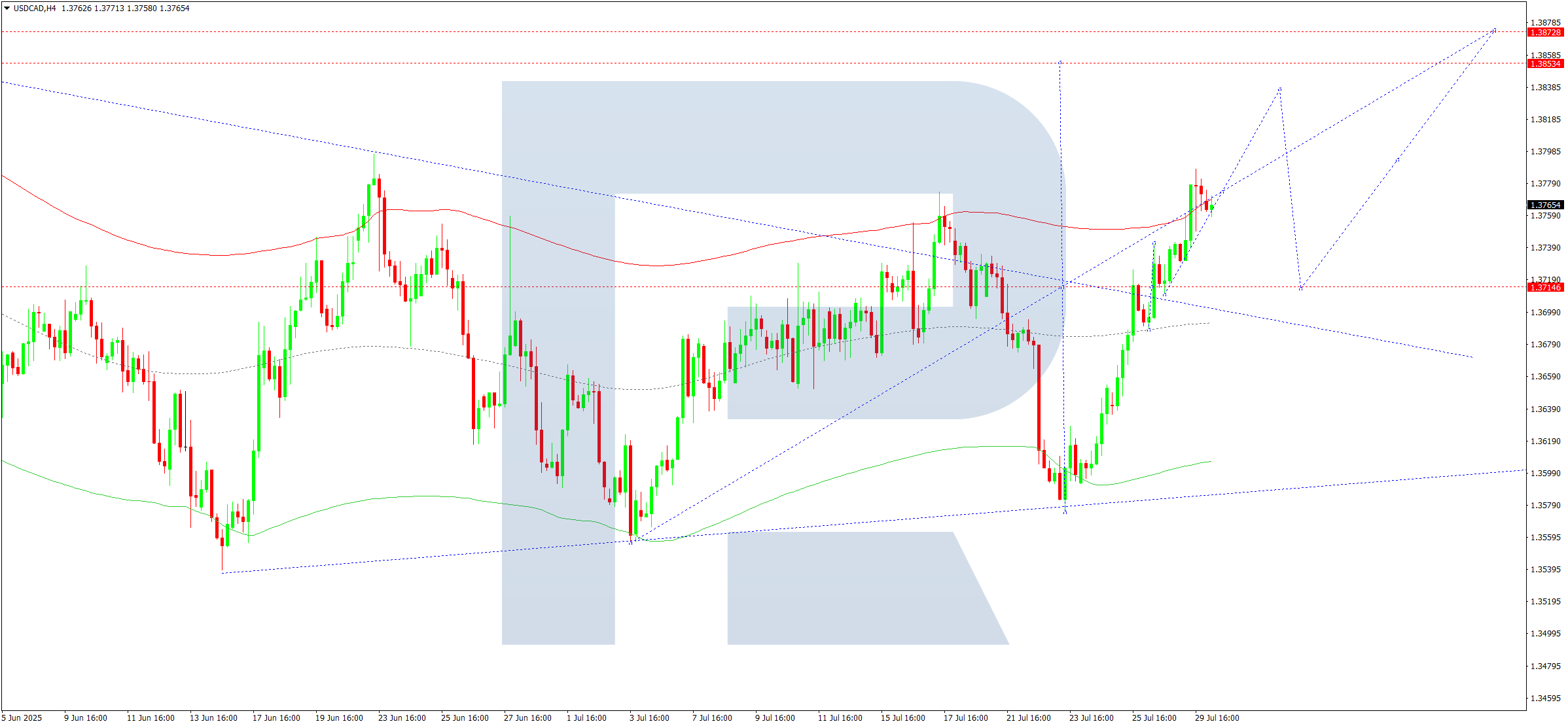 USDCAD жұбының H4 графигінде нарық 1.3752 деңгейі маңында консолидация жасауда. Бүгін, 2025 жылғы 30 шілдеде, жоғарыға бұзылу болып, 1.3790 деңгейіне дейін көтерілуі мүмкін. Бұл толқын 1.3850 деңгейіне дейін созылуы ықтимал.