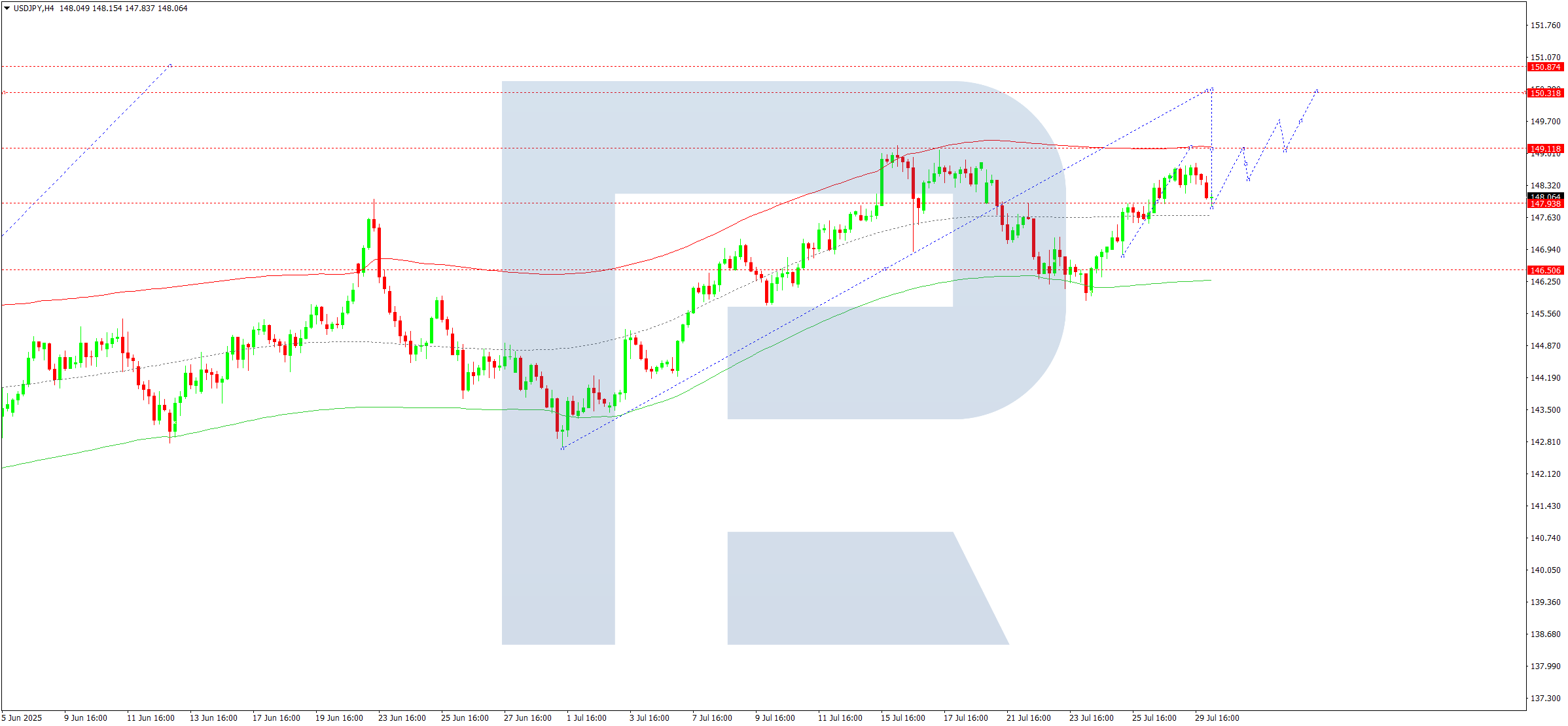USDJPY жұбының H4 графигінде нарық 148.00 деңгейі маңында консолидация құруда. Бүгін, 2025 жылғы 30 шілдеде, өсу 149.11 деңгейіне дейін жалғасуы мүмкін, әрі қарай тренд 150.00 деңгейіне дейін жетуі ықтимал.