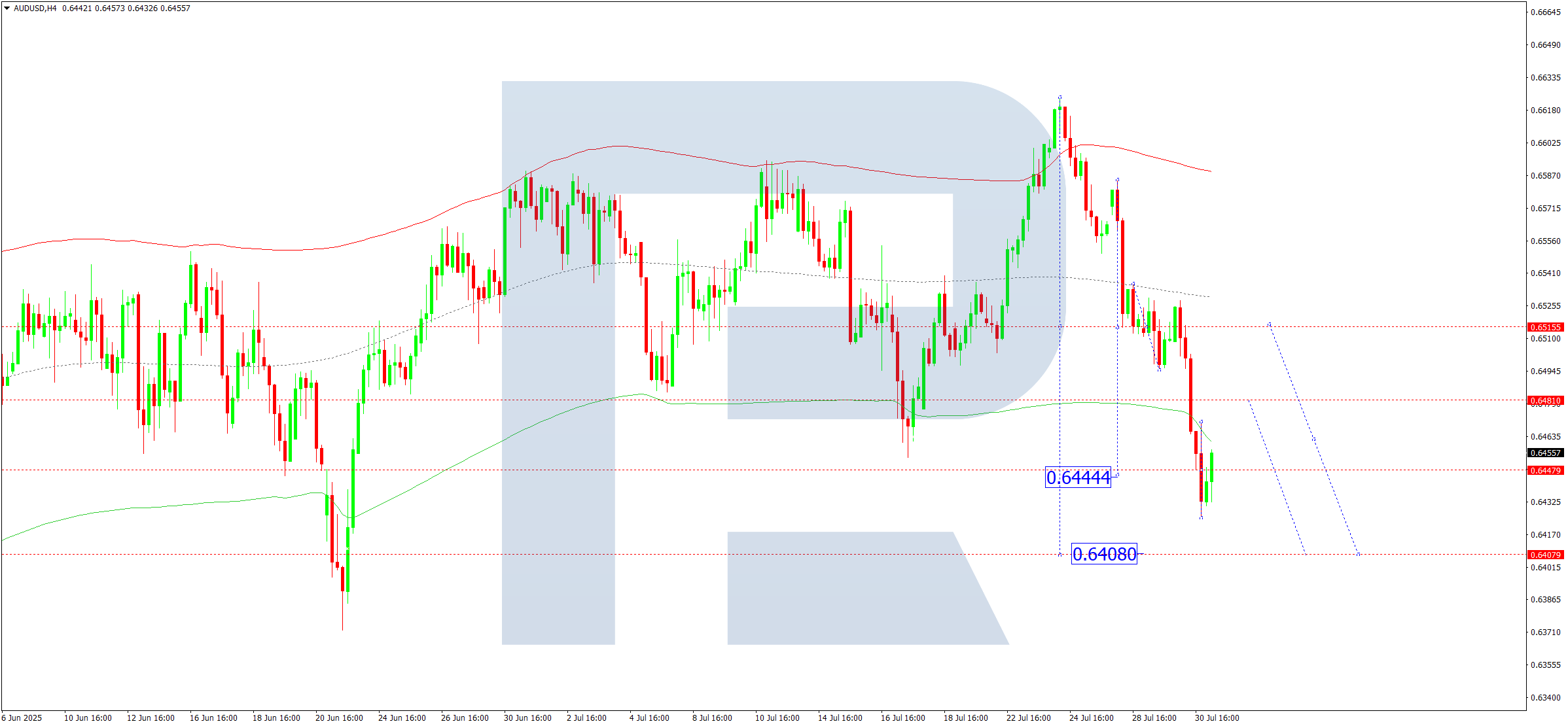AUDUSD жұбының H4 графигінде нарық 0.6444 деңгейі маңында консолидация диапазонын құруда. Бүгін, 2025 жылғы 31 шілдеде, баға жоғарыға бұзылса – 0.6555 деңгейіне дейін түзету мүмкін. Ал егер төменге бұзылса – төмендеу толқыны 0.6408 деңгейіне дейін жалғасуы ықтимал.