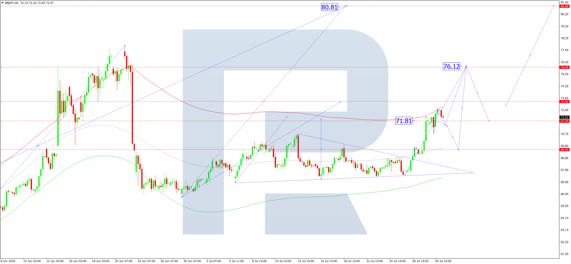 Brent маркалы мұнайдың H4 графигінде нарық 72.65 деңгейіне дейін өсу толқынын аяқтады. Бүгін, 2025 жылғы 31 шілдеде, осы деңгейден төмен консолидация диапазоны құрылуы мүмкін. Егер баға жоғарыға бұзылса, толқын 73.33 және әрі қарай 76.00 деңгейіне дейін жалғасуы мүмкін.