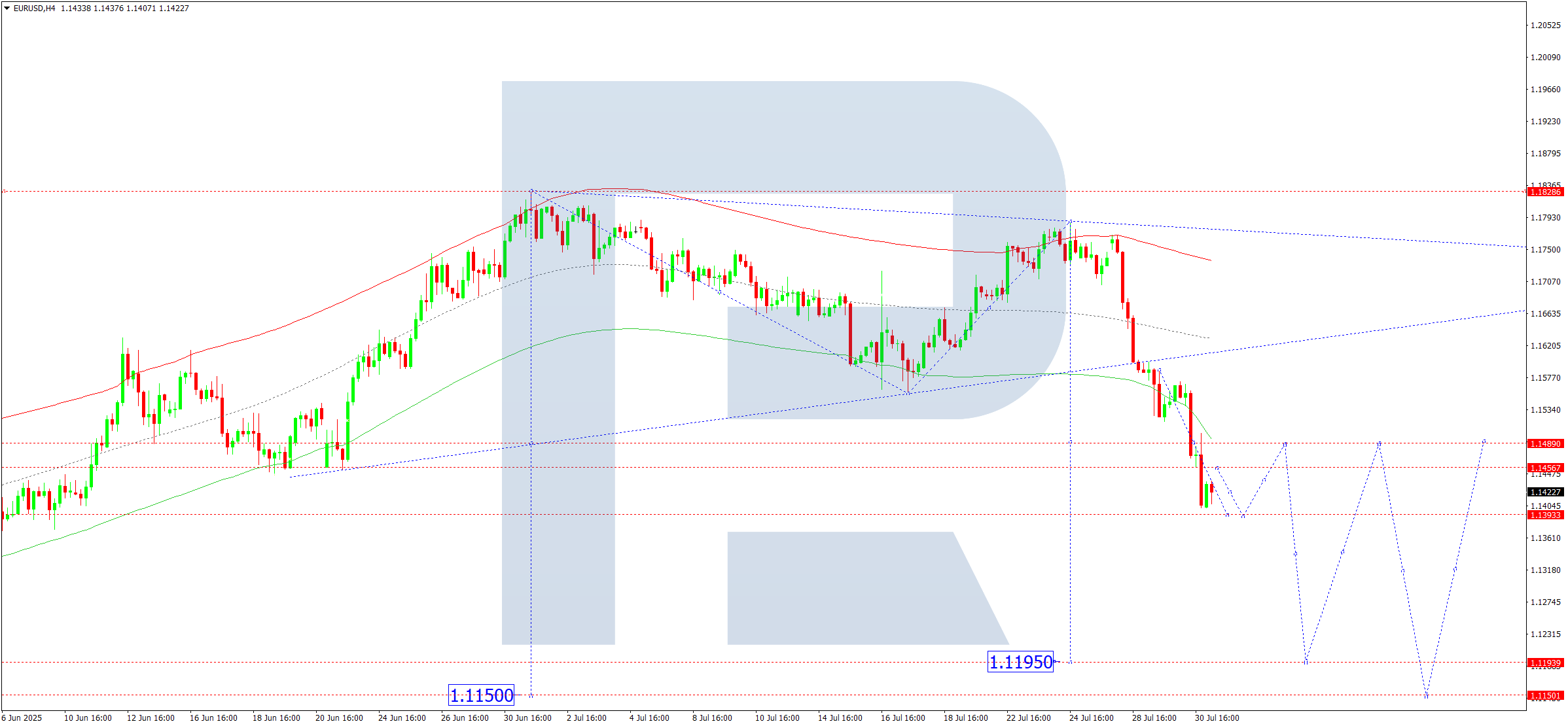 EURUSD жұбының H4 графигінде нарық 1.1400 деңгейіне дейін төмендеу толқынын аяқтады. Бүгін, 2025 жылғы 31 шілдеде, осы деңгейден жоғары консолидация диапазоны құрылуда. Диапазон жоғары қарай 1.1455 және төмен қарай 1.1393 деңгейіне кеңеюі мүмкін. Одан кейін 1.1490 деңгейіне дейін түзету ықтимал, кейін 1.1200 деңгейіне дейін жергілікті мақсатқа төмендеуі мүмкін.