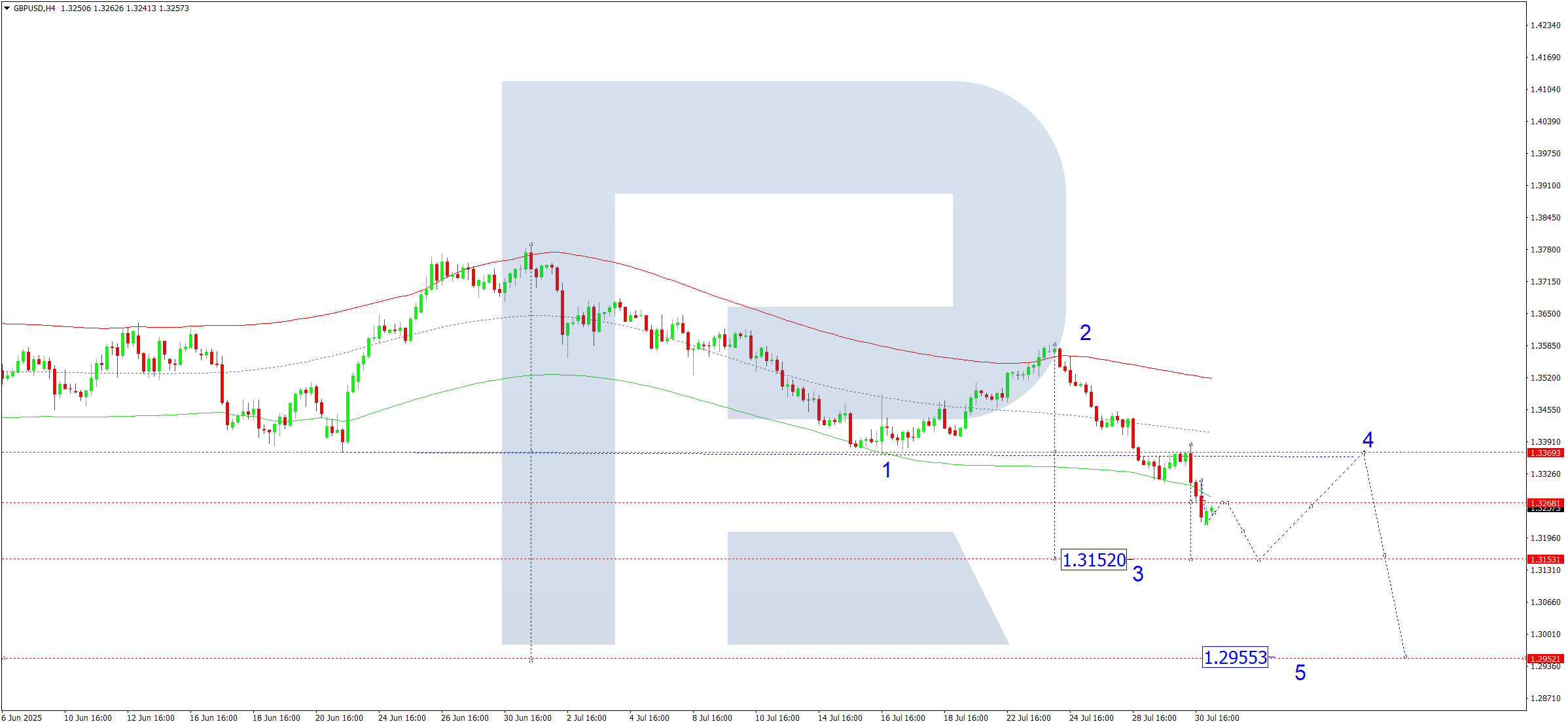 GBPUSD жұбының H4 графигінде нарық 1.3230 деңгейіне дейін төмендеу толқынын аяқтады. Бүгін, 2025 жылғы 31 шілдеде, осы деңгейден жоғары консолидация диапазоны құрылуы мүмкін. Қысқа мерзімді көтерілу 1.3270 деңгейіне дейін, кейін 1.3152 деңгейіне дейін төмендеу орын алуы ықтимал.