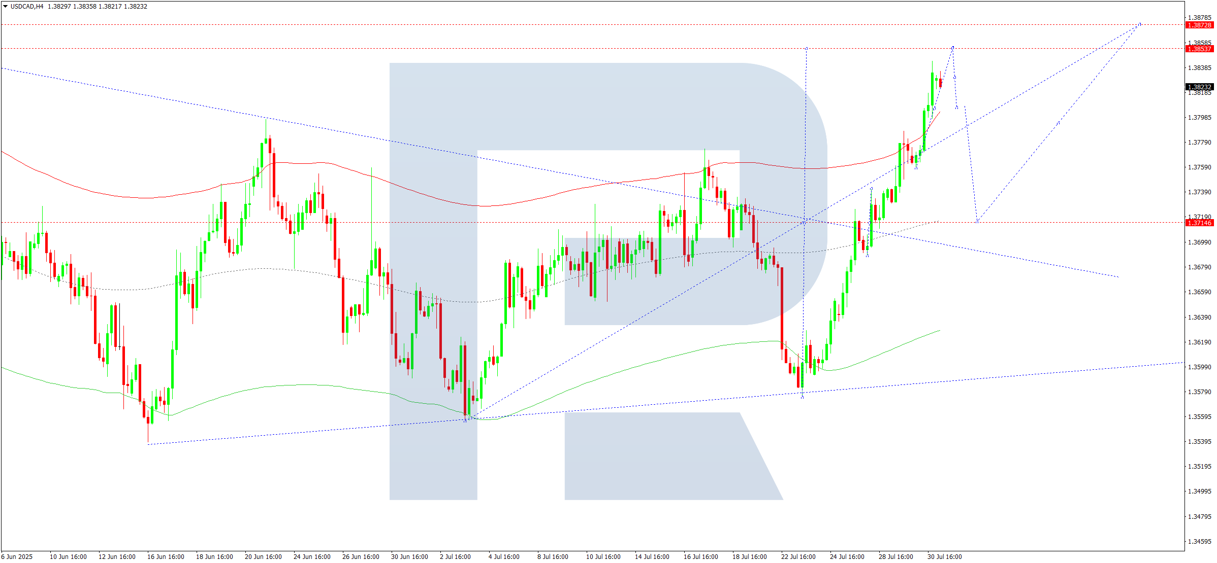 USDCAD жұбының H4 графигінде нарық 1.3850 деңгейіне дейін өсу толқынын құруда. Бүгін, 2025 жылғы 31 шілдеде, осы мақсатты деңгейге жету күтіледі. Кейін 1.3715 деңгейіне дейін түзету басталуы мүмкін.