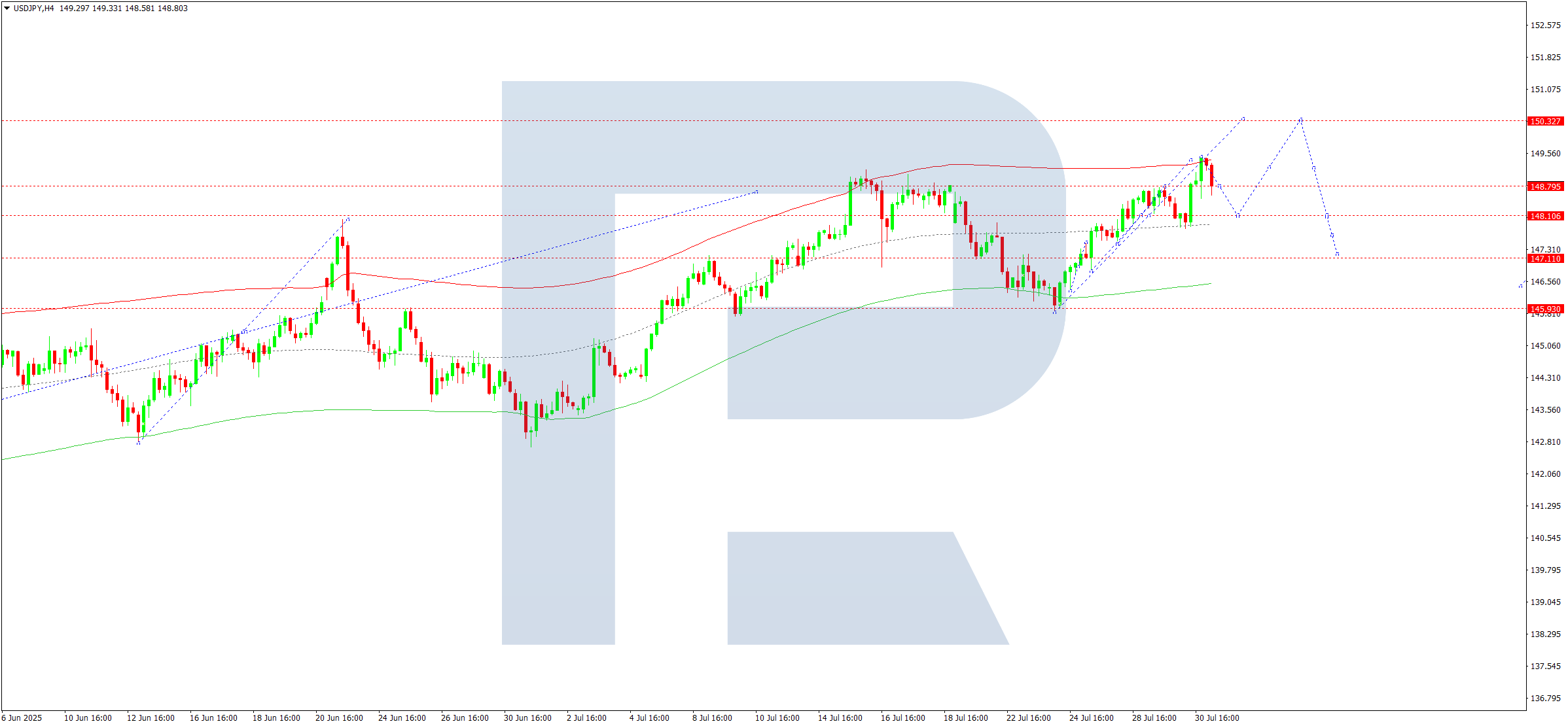 USDJPY жұбының H4 графигінде нарық 149.45 деңгейіне дейін өсу толқынын аяқтады. Бүгін, 2025 жылғы 31 шілдеде, 148.10 деңгейіне дейін түзету күтіледі. Кейін жаңа өсу толқыны 150.30 деңгейіне дейін жалғасуы мүмкін.