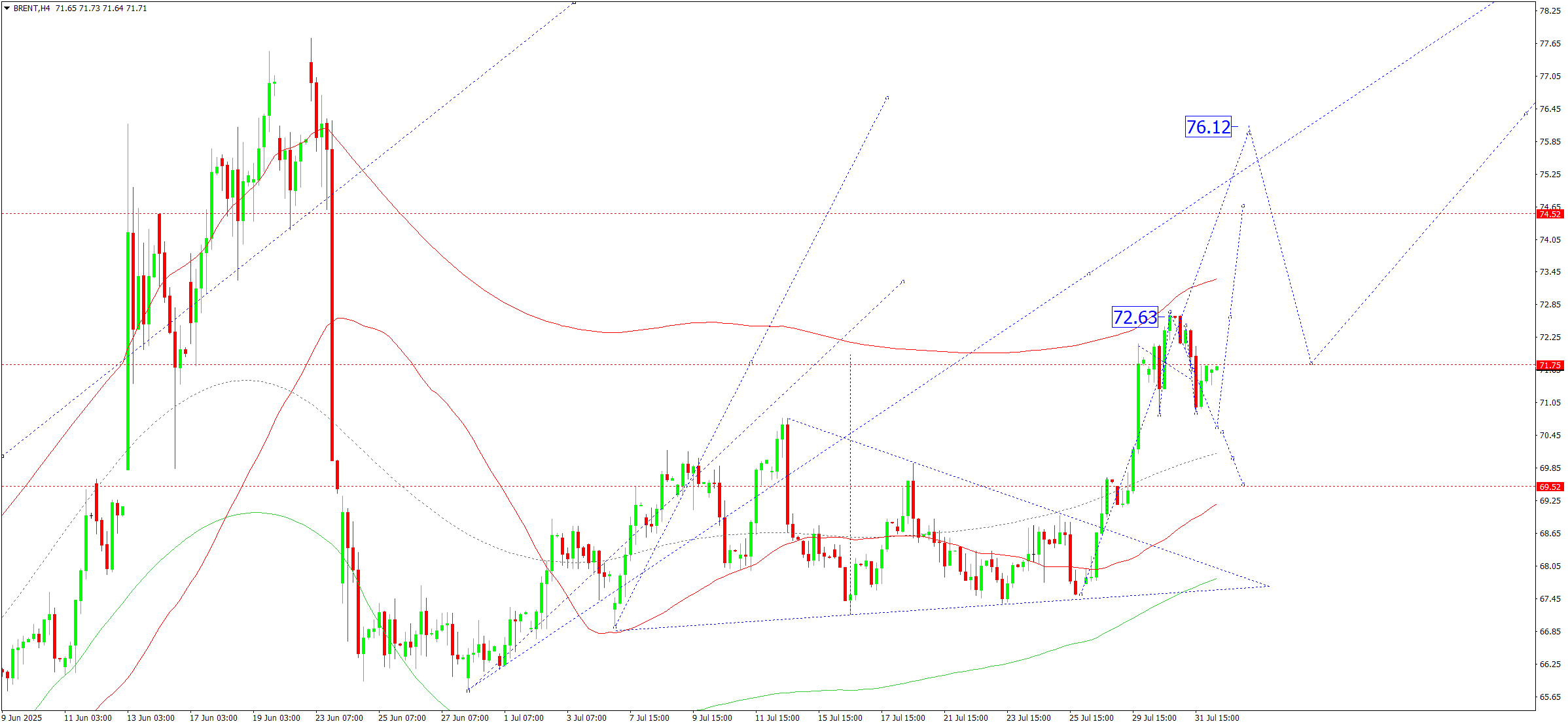 Техникалық тұрғыдан бұл сценарий 71.80 бұрылу нүктесімен белгіленген Elliott толқын құрылымы мен өсу толқыны матрицасымен расталады. Бұл деңгей Brent толқынының ағымдағы құрылымында негізгі болып қалады. Нарық Price Envelope-тің орталық сызығы – 71.80 деңгейі маңында консолидацияда. Қысқа мерзімді түзету 70.00 деңгейіне дейін, одан соң 73.33 және 76.00 деңгейлеріне дейін өсу қозғалысы мүмкін.