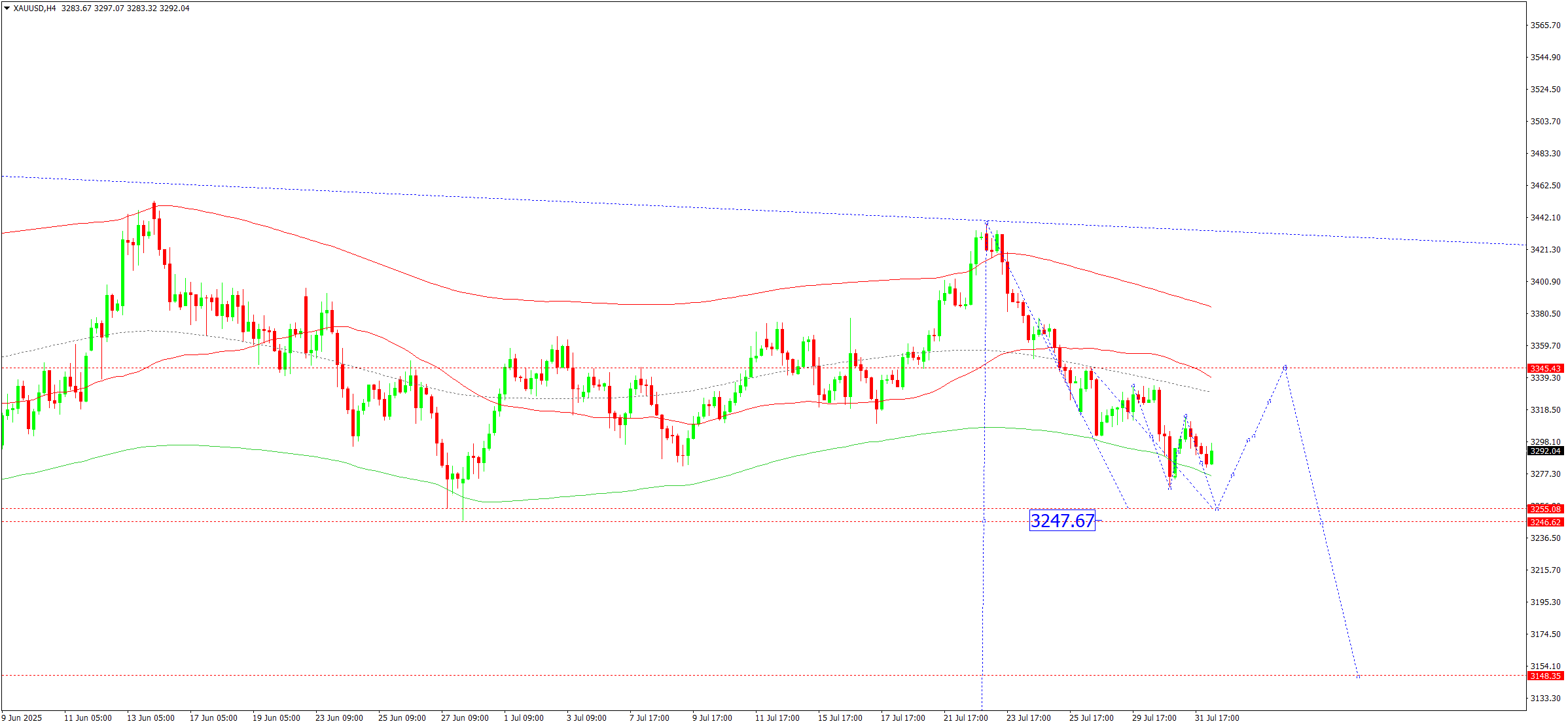 XAUUSD жұбының H4 графигінде нарық 3,300 деңгейі маңында консолидация диапазонын қалыптастыруда. Диапазон қазіргі таңда 3,268 – 3,314 аралығында кеңейді. Бүгін, 2025 жылғы 1 тамызда, 3,247 деңгейіне дейін төмендеу орын алуы мүмкін – бұл жергілікті мақсат.