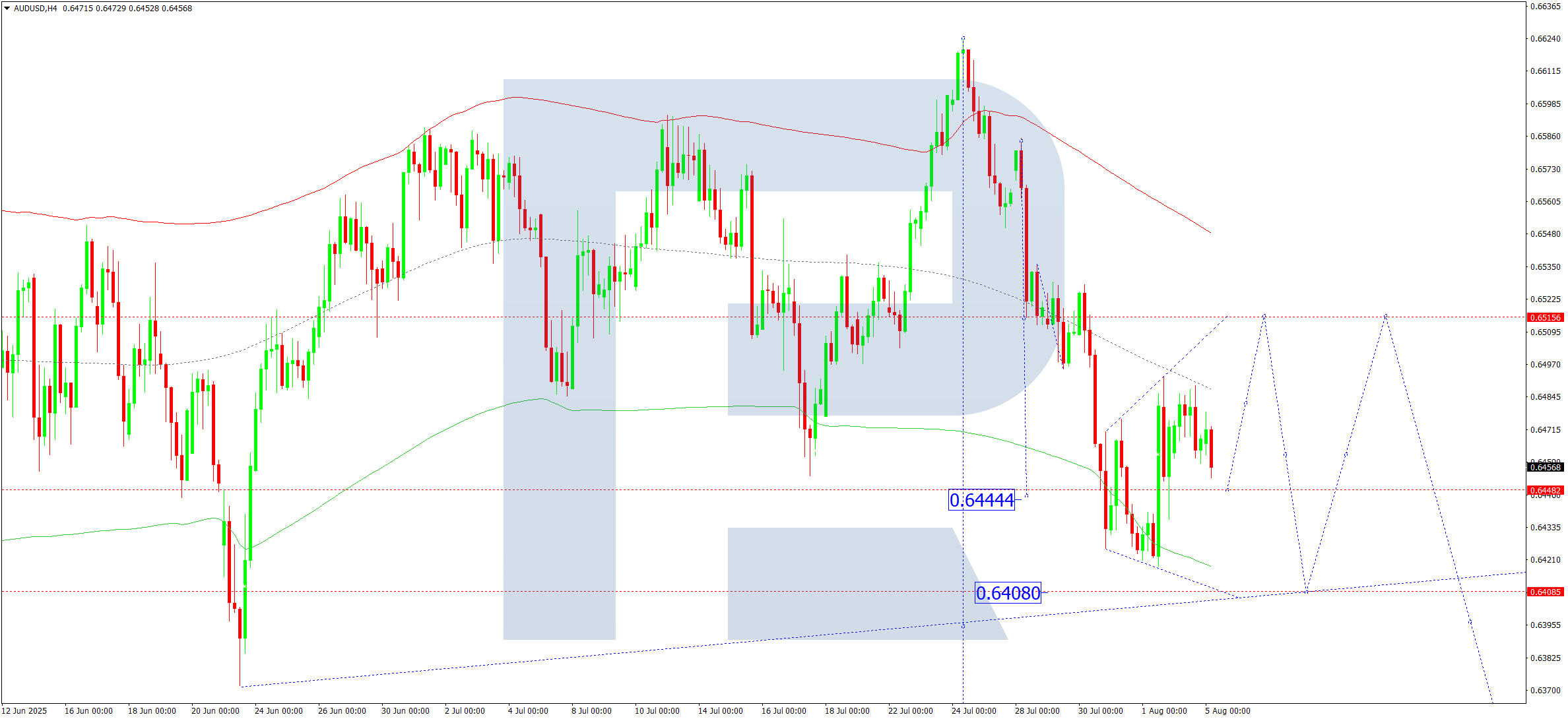 AUDUSD жұбының H4 графигінде нарық 0.6464 деңгейі маңында айқын трендсіз консолидация диапазонын қалыптастыруда. Бүгін, 2025 жылғы 5 тамызда, егер жоғары бұзылса – 0.6515 деңгейіне дейін түзету болуы мүмкін. Төменгі бағыттағы бұзылу жағдайында – бірінші мақсат ретінде 0.6408 деңгейіне дейін толқын жалғасуы ықтимал.