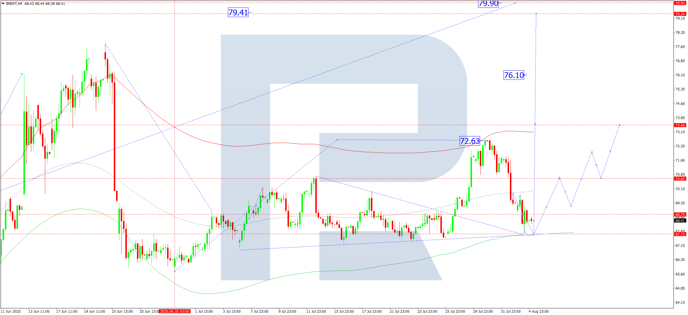 Brent маркалы мұнайдың H4 графигінде нарық 68.75 деңгейі маңында консолидация диапазонын қалыптастырды. Бүгін, 2025 жылғы 5 тамызда, бұл диапазон 67.77 деңгейіне дейін кеңеюі мүмкін. Кейіннен 70.64 деңгейіне дейін жаңа өсу толқыны басталуы ықтимал. Егер бұл деңгей жоғары бұзылса, тренд 76.10 деңгейіне дейін жалғасуы мүмкін.