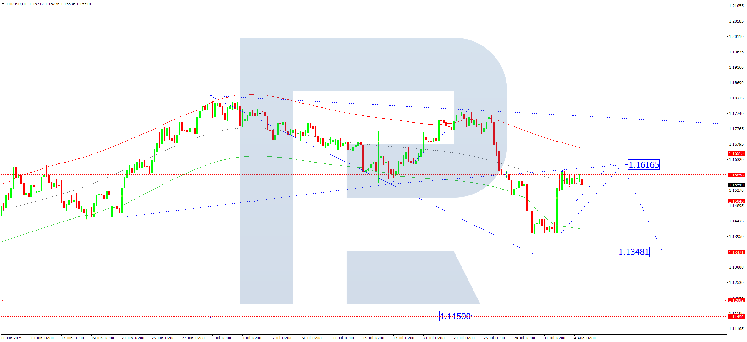 EURUSD жұбының H4 графигінде нарық 1.1550 деңгейі маңында анық емес трендпен тығыз консолидация диапазонын қалыптастыруды жалғастыруда. Бүгін, 2025 жылғы 5 тамызда, бұл диапазон жоғарыға қарай 1.1616 деңгейіне және төменге қарай 1.1347 деңгейіне дейін кеңеюі мүмкін. Бірінші мақсат осы диапазон ішінде орналасқан. Кейіннен бағаның 1.1550 деңгейіне оралуы ықтимал – бұл екінші мақсат.