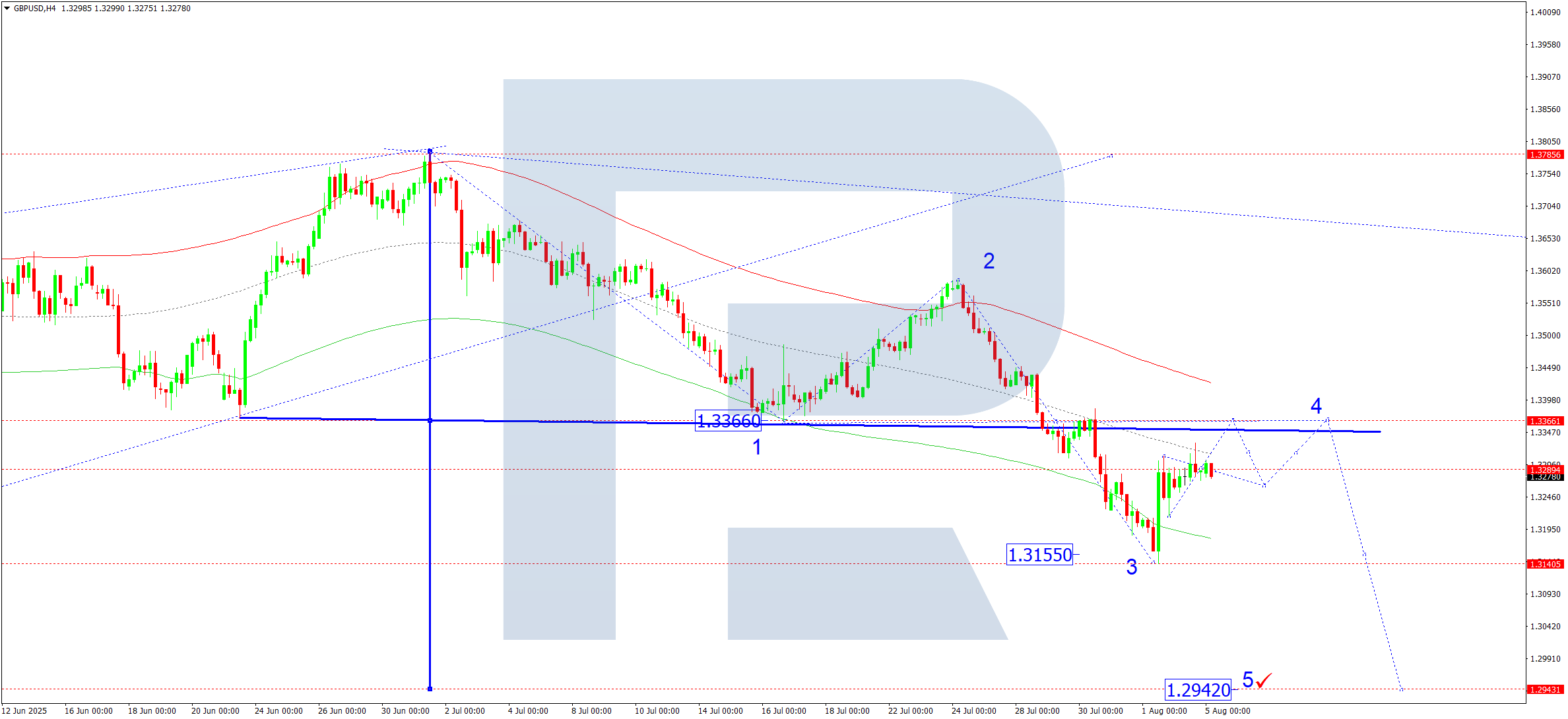 GBPUSD жұбының H4 графигінде нарық 1.3289 деңгейі маңында тығыз консолидация диапазонын қалыптастыруда. Бүгін, 2025 жылғы 5 тамызда, егер баға жоғары бұзылса – 1.3366 деңгейіне дейін өсу, ал егер төмен бұзылса – бесінші толқын түріндегі төмендеу толқыны жалғасып, 1.2942 деңгейін мақсат етуі мүмкін.