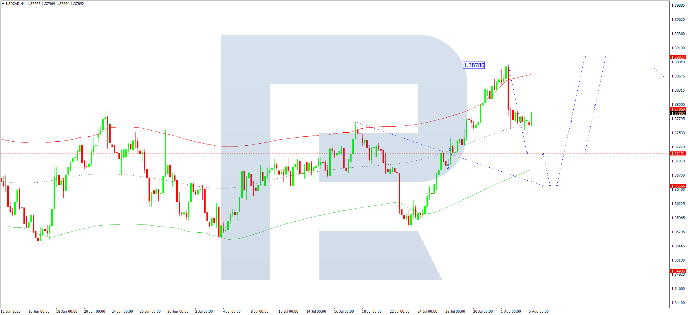 USDCAD жұбының H4 графигінде нарық 1.3800 деңгейі маңында айқын трендсіз консолидация диапазонын қалыптастыруда. Бүгін, 2025 жылғы 5 тамызда, түзету толқыны 1.3715 деңгейіне дейін жалғасуы мүмкін. Кейін 1.3890 деңгейіне дейін көтерілу күтіледі.