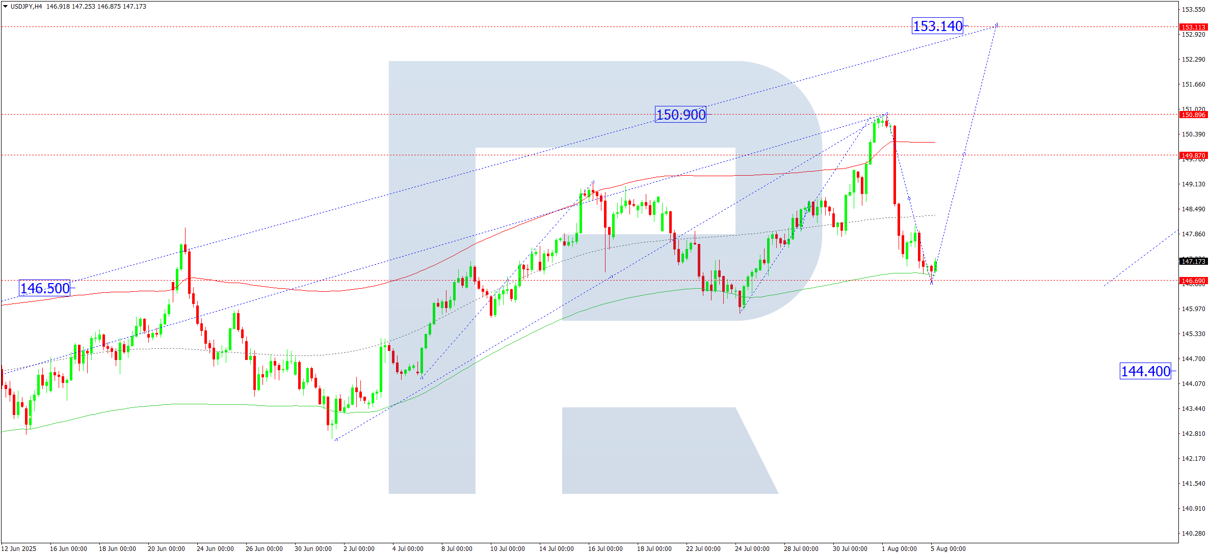 USDJPY жұбының H4 графигінде нарық 146.70 деңгейіне дейінгі түзетуді аяқтады. Бүгін, 2025 жылғы 5 тамызда, 149.80 деңгейіне дейін көтерілу, кейін 153.14 мақсатымен бесінші толқын құрылымын қалыптастыру ықтимал.
